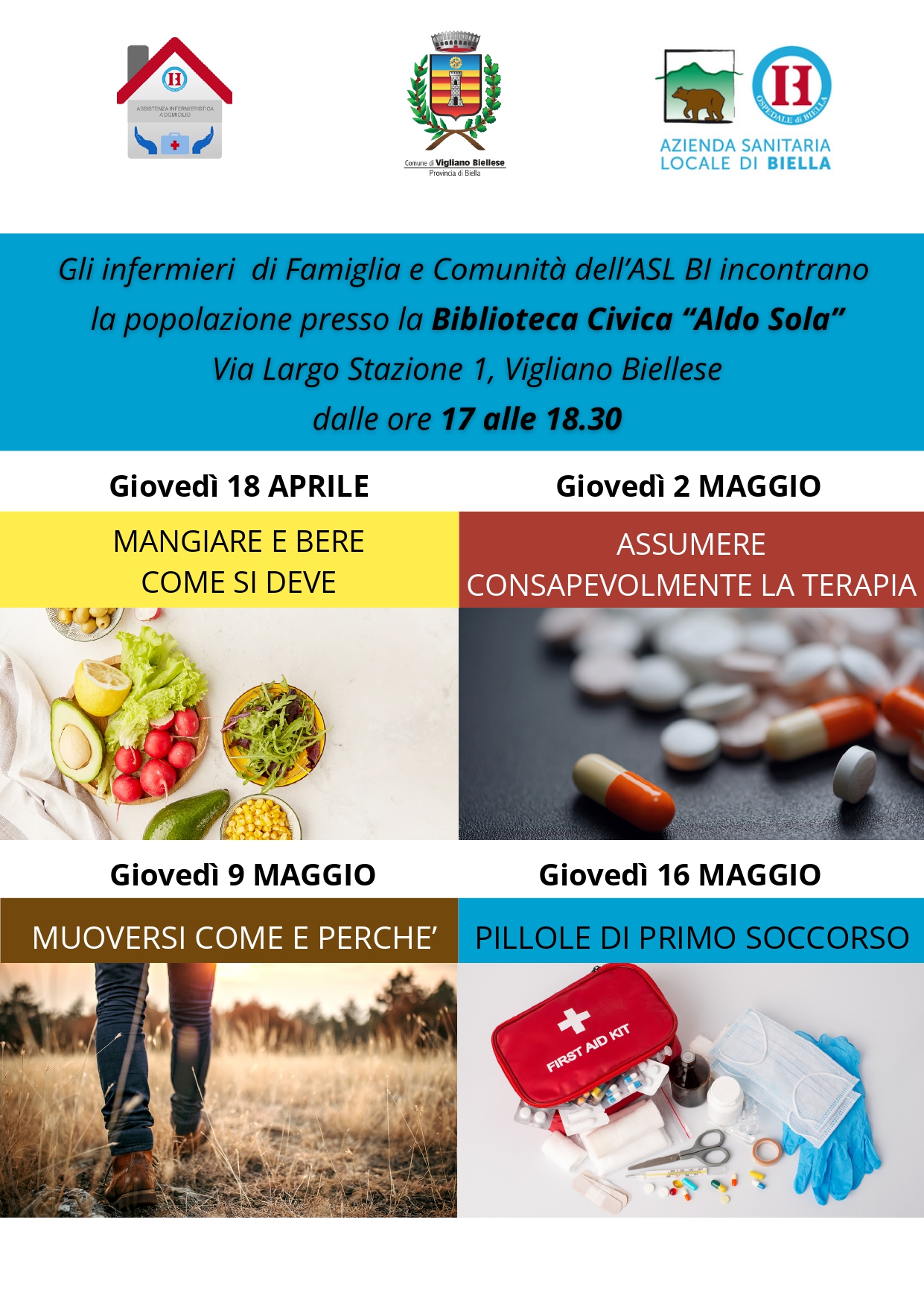 La Biblioteca Civica Aldo Sola ospiterà nei prossimi giovedì una serie di 4 incontri su temi legati alla prevenzione e ai corretti stili di vita per mantenere una buona salute. Il progetto nasce dalla sinergia fra l’Amministrazione Comunale e gli infermieri di famiglia e comunità dell’ASLBI.