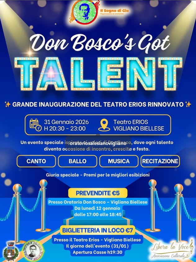 Sabato 31 gennaio, alle 20.30, al Teatro Erios, l'Associazione Il sogno di Giò Odv, con il patrocinio del Comune di Vigliano Biellese, invita ad un evento ispirato ai valori di Don Bosco, in cui canto, ballo, musica e recitazione saranno protagonisti della serata. Una giuria speciale assegnerà i premi per le migliori esibizioni.