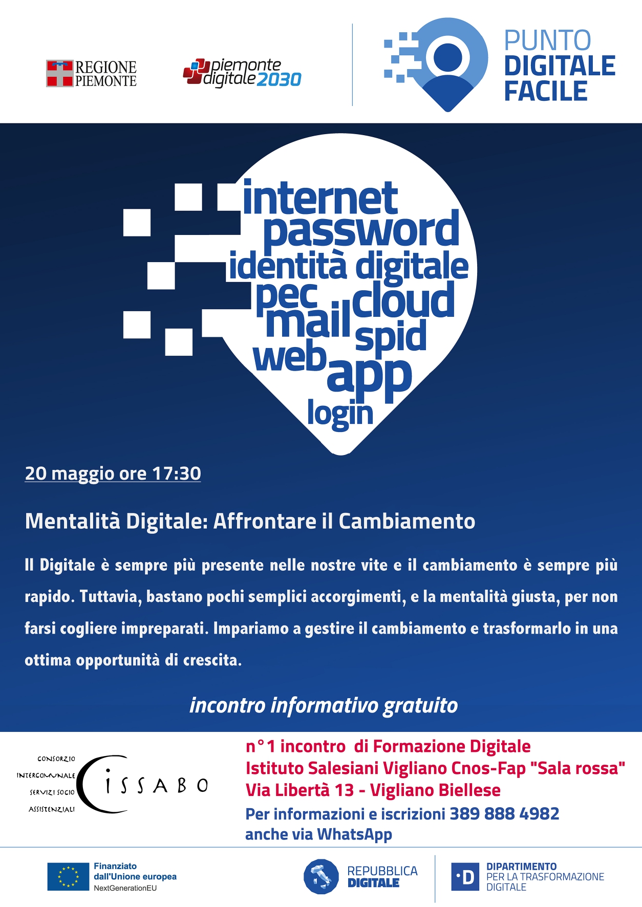 Martedì 20 maggio alle ore 17.30 il CISSABO, con la collaborazione del Consorzio Filo da Tessere e con il formatore Massimiliano Monti, organizza un incontro formativo gratuito di facilitazione digitale, presso l'Istituto Salesiani Vigliano Cnos-Fap "Sala rossa" Via Libertà n. 13.