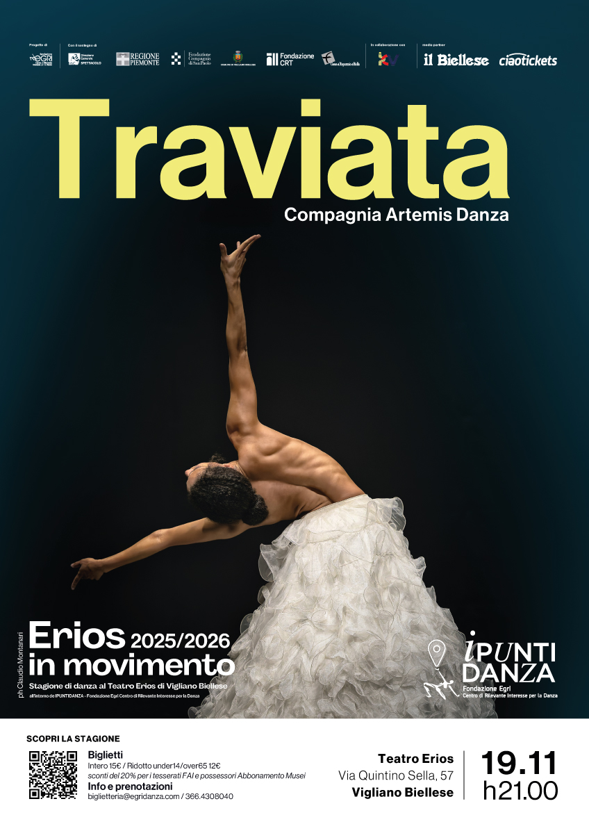 Mercoledì 19 novembre 2025 alle ore 21, al Teatro Erios la Compagnia Artemis Danza porterà in scena lo spettacolo di danza "TRAVIATA".