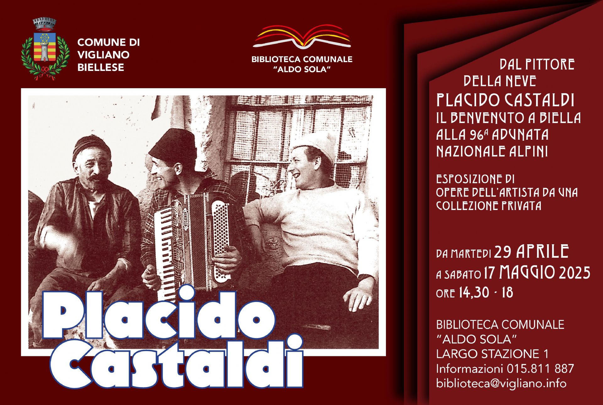 «Un ringraziamento particolare – è il commento del Sindaco, Cristina Vazzoler - a Sergio Caneparo, cui si deve l’idea di questa esposizione con cui Vigliano rende possibile la conoscenza delle opere di Placido Castaldi ad un pubblico particolare, costituito dagli oltre settecento Alpini che saranno ospitati nel nostro paese proprio in relazione all’Adunanza nazionale. Offriremo quindi a loro, oltre che a tutta la nostra collettività, la possibilità di vedere una selezione particolare di dipinti particolarmente significativi per l’esperienza artistica e umana dell’artista. Pittore che, nella fotografia scelta dal curatore per il manifesto, è ritratto in un momento di svago insieme ad Aldo Sola, suo grande amico, cui la nostra Biblioteca è dedicata: una foto che sembra racchiudere l’idea di questa mostra nella nostro contesto viglianese. Grazie inoltre ad Adriano Leone, Presidente del nostro Consiglio di Biblioteca, che ha realizzato i materiali divulgativi di questa iniziativa. L’esposizione sarà aperta tutti i giorni, dalle 14.30 alle 18 dal 29 aprile fino al 17 maggio, domeniche comprese.»