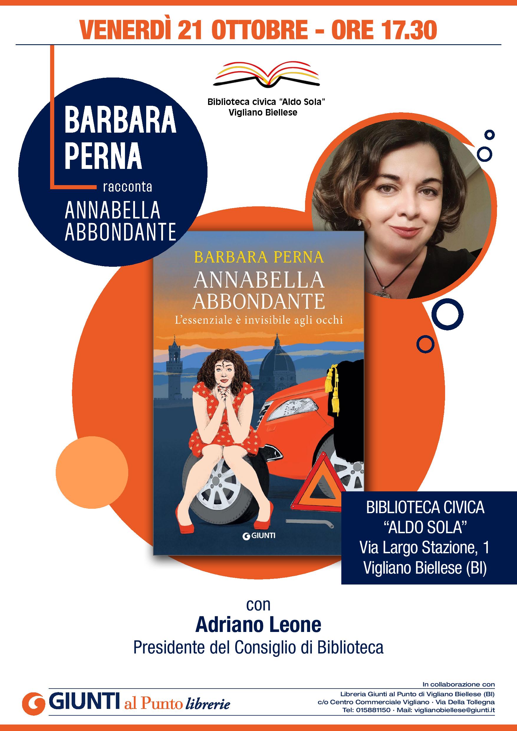 Venerdì 21 ottobre, alle ore 17.30, la scrittrice Barbara Perna incontrerà i lettori nella biblioteca civica "Aldo Sola" e presenterà il suo nuovo romanzo Annabella Abbondante – L’essenziale è invisibile agli occhi, che fa seguito al successo di Annabella Abbondante – La verità non è una chimera.