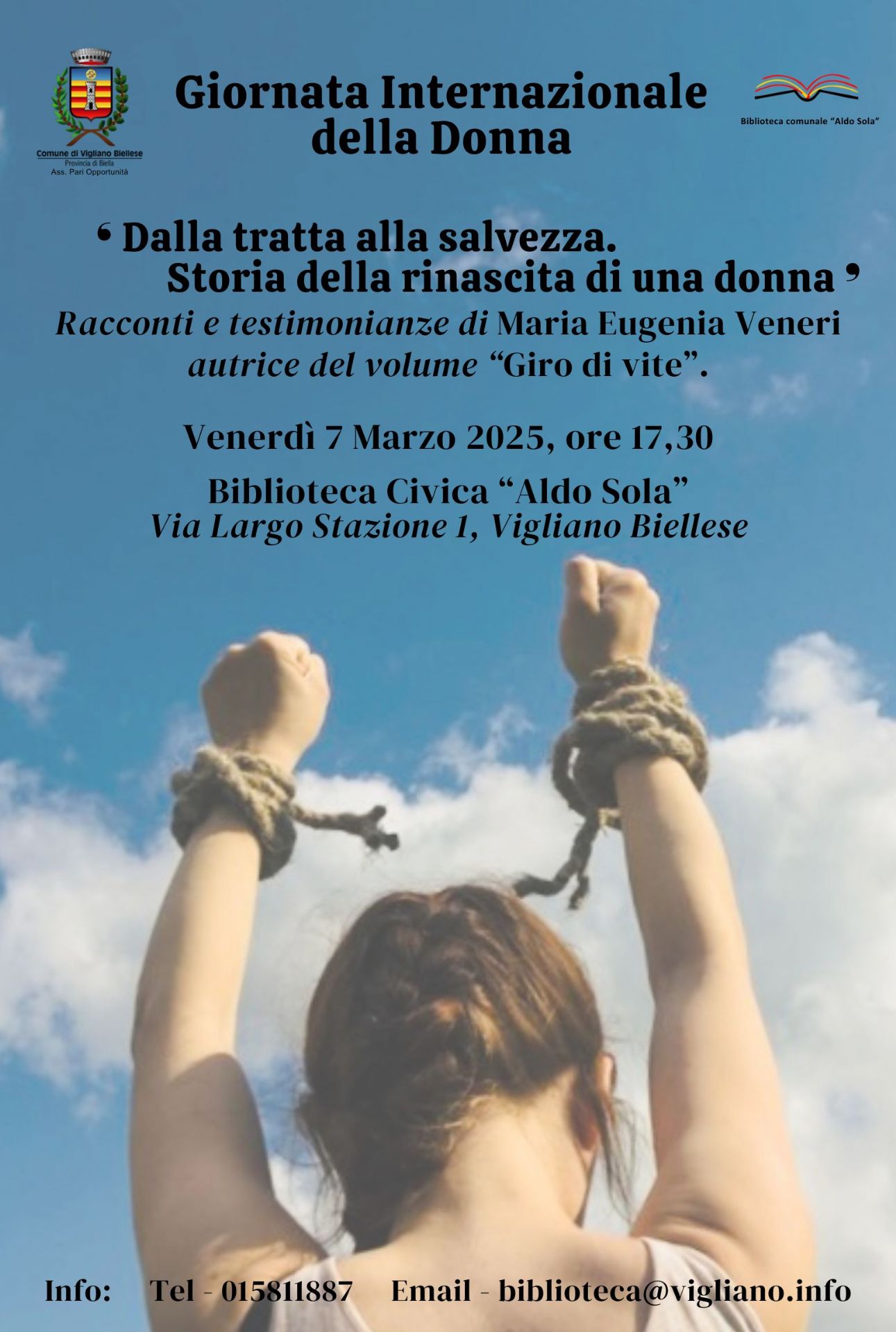 Venerdì 7 marzo 2025 alle ore 17,30 In occasione della “Giornata Internazionale della donna”, la biblioteca comunale ospiterà Maria Eugenia Veneri con un intervento dal titolo "Dalla tratta alla salvezza. Storia della rinascita di una donna".