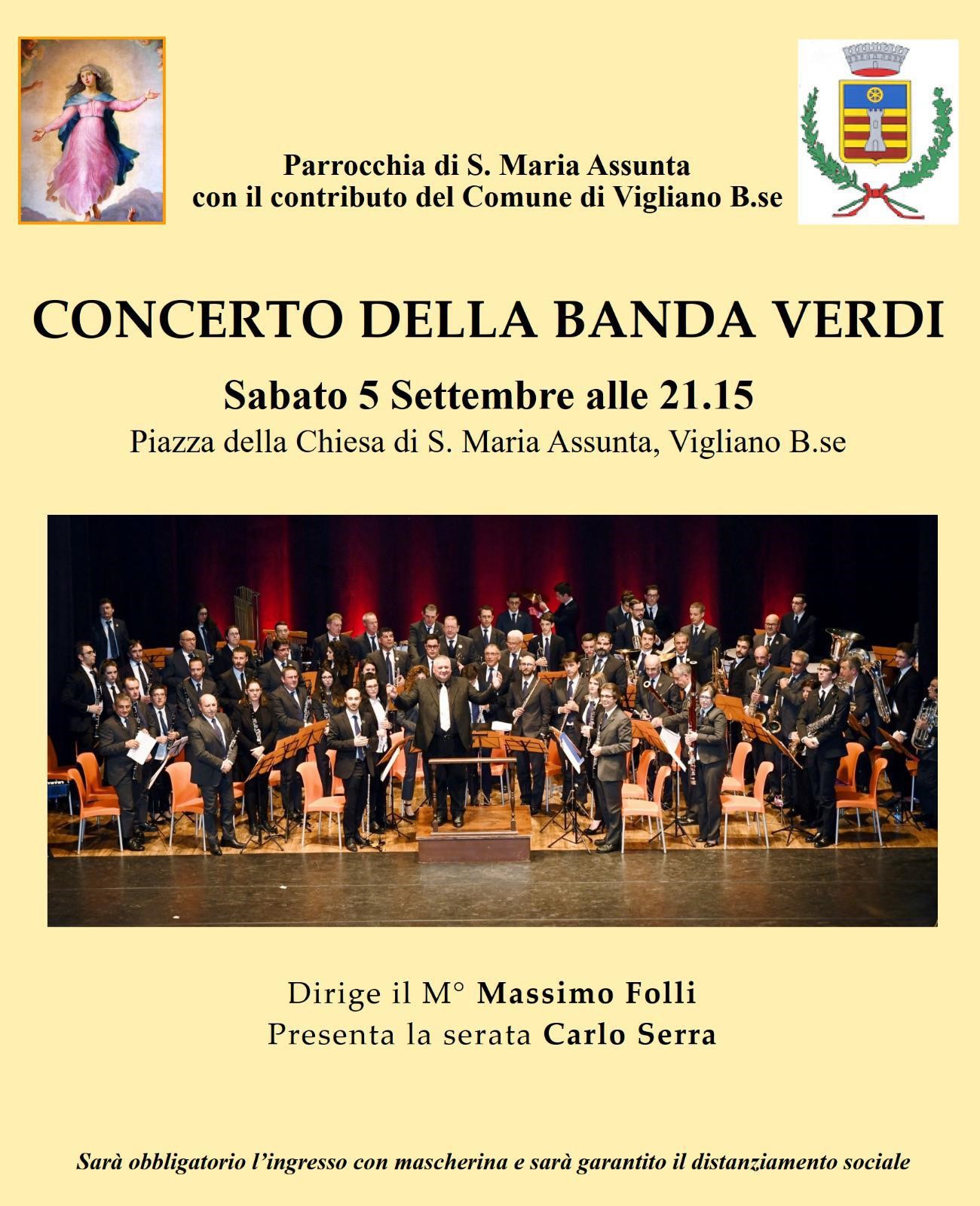 Alle 21.15 di Sabato 5 Settembre, la Piazza della Chiesa Parrocchiale di Santa Maria Assunta ospiterà un concerto della Banda Verdi, prestigiosa realtà musicale biellese, che conta tra le sue fila circa una settantina di musicisti, tra i quali molti giovani e che in questo 2020 festeggia 110 anni di vita. Direttore della Banda Verdi, dal 1999, è il maestro Massimo Folli, che guiderà l'ensemble anche nel concerto a Vigliano. A presentare la serata, Carlo Serra.
