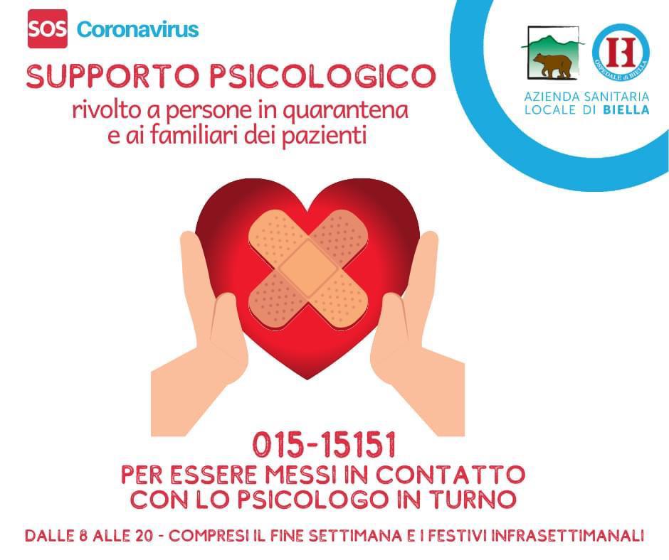Il Sindaco, Cristina Vazzoler, intende dare ampia conoscenza al servizio di supporto psicologico che l'ASL BI ha attivato per persone in quarantena, familiari di pazienti ricoverati, o in lutto dopo una perdita, per aiutare chi sta affrontando il Coronavirus direttamente o in via indiretta.
