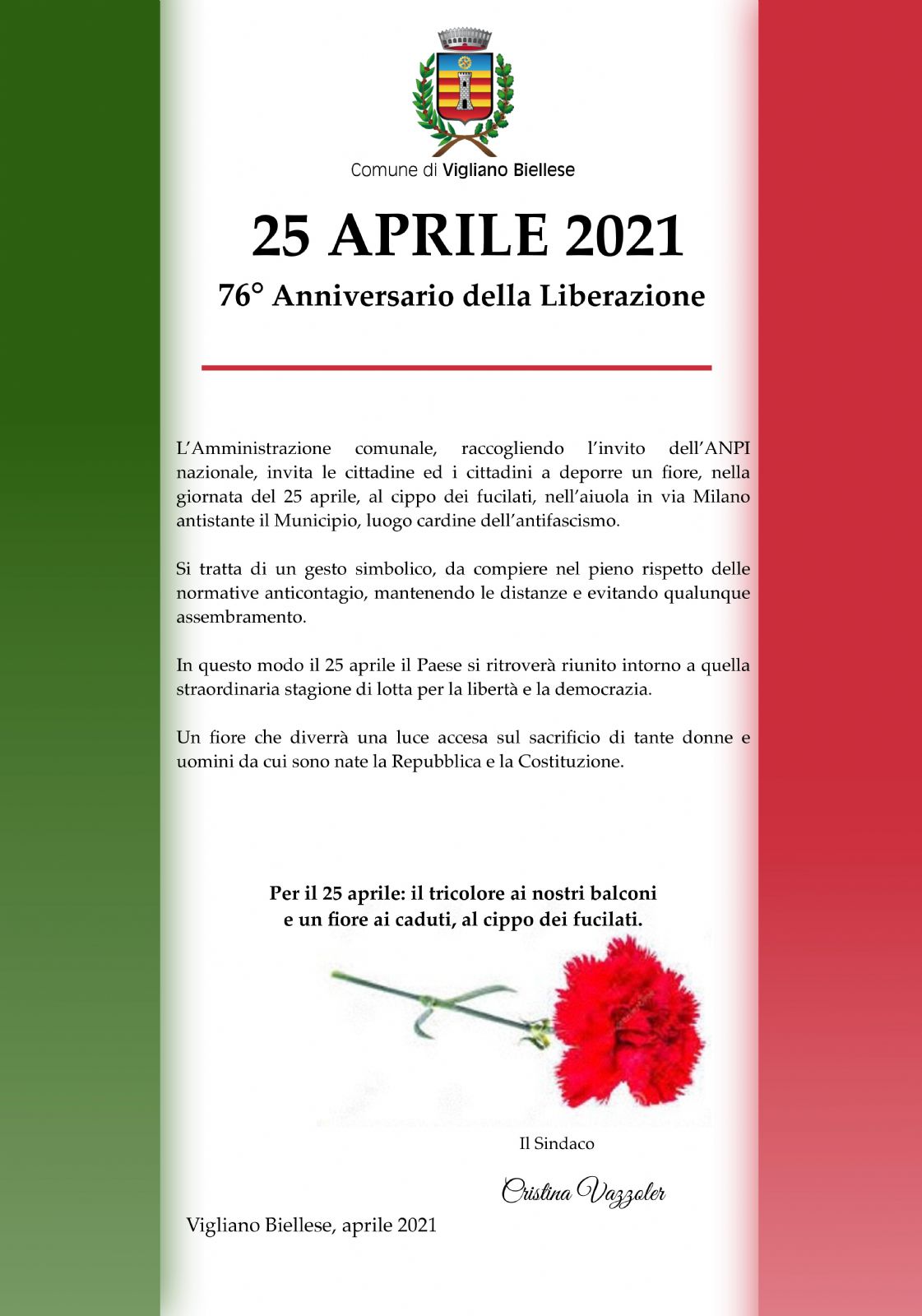 Raccogliendo l’invito dell’ANPI nazionale, il Sindaco, Cristina Vazzoler, invita le cittadine ed i cittadini a deporre un fiore, nella giornata del 25 aprile, al cippo dei fucilati, nell’aiuola in via Milano antistante il Municipio, luogo cardine dell’antifascismo.
