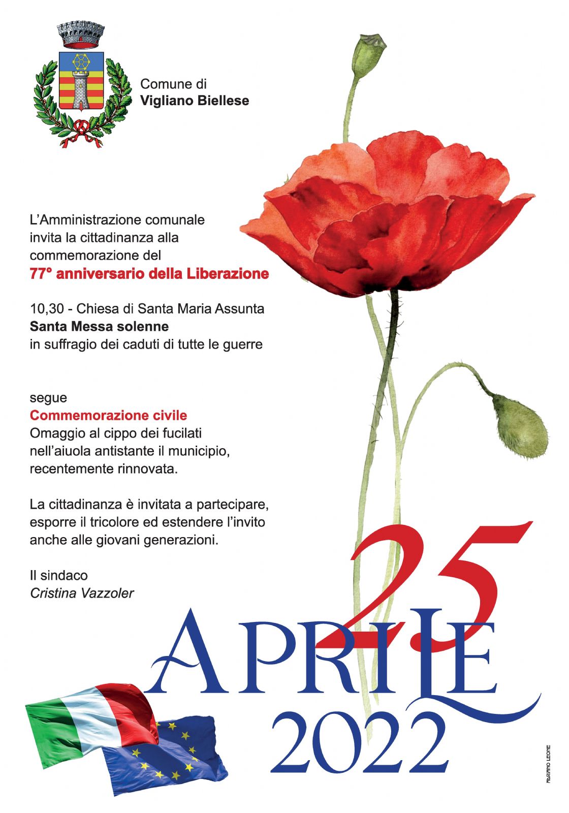L'Amministrazione comunale invita la cittadinanza alla commemorazione del 77° anniversario della Liberazione. Lunedì 25 aprile, alle ore 10.30, nella Chiesa di Santa Maria Assunta, sarà celebrata la Santa Messa solenne in suffragio dei caduti di tutte le guerre. A seguire, la commemorazione civile, che si concluderà con la posa della corona e l'omaggio al cippo dei fucilati, nell'aiuola antistante il Municipio, recentemente rinnovata. La cittadinanza è invitata a partecipare, esporre il tricolore ed estendere l'invito anche alle giovani generazioni.