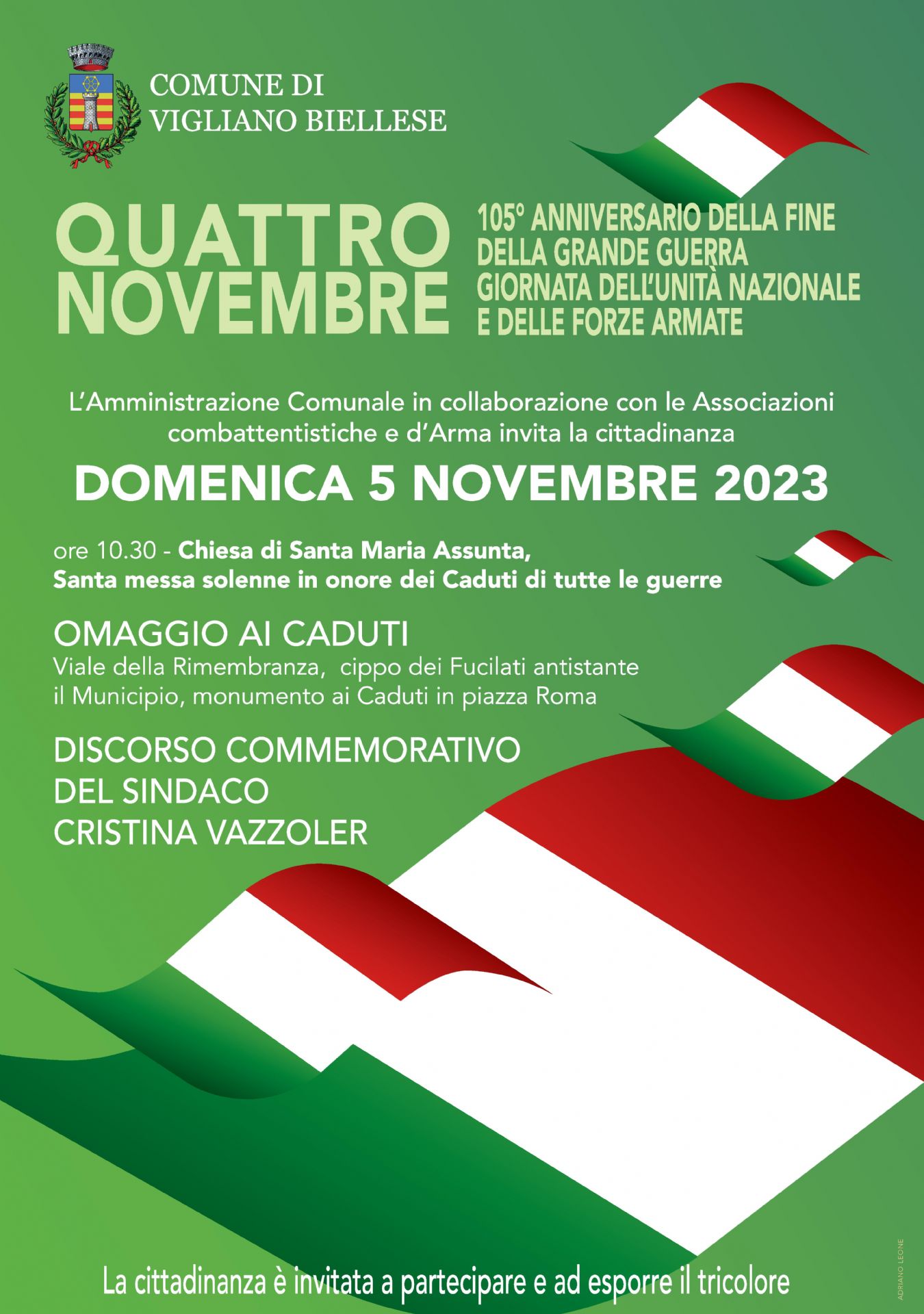 L'Amministrazione comunale invita la cittadinanza a partecipare alle celebrazioni, e ad esporre il tricolore, in occasione del IV novembre 2023, 105° anniversario della fine della Grande Guerra, Giornata dell'Unità nazionale e delle Forze Armate.
