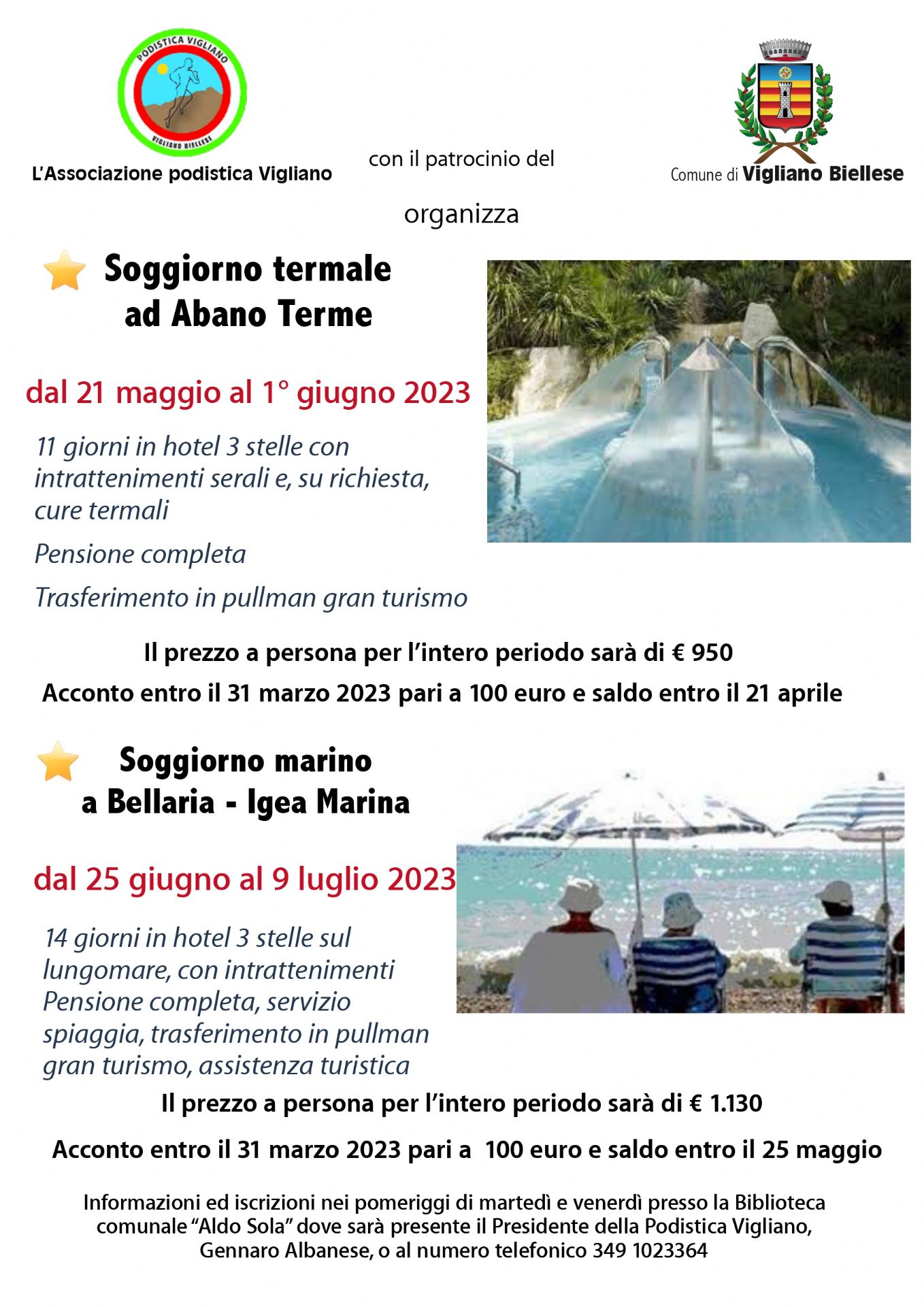 L'Associazione sportiva Podistica Vigliano, con il patrocinio del Comune, organizza due soggiorni estivi.