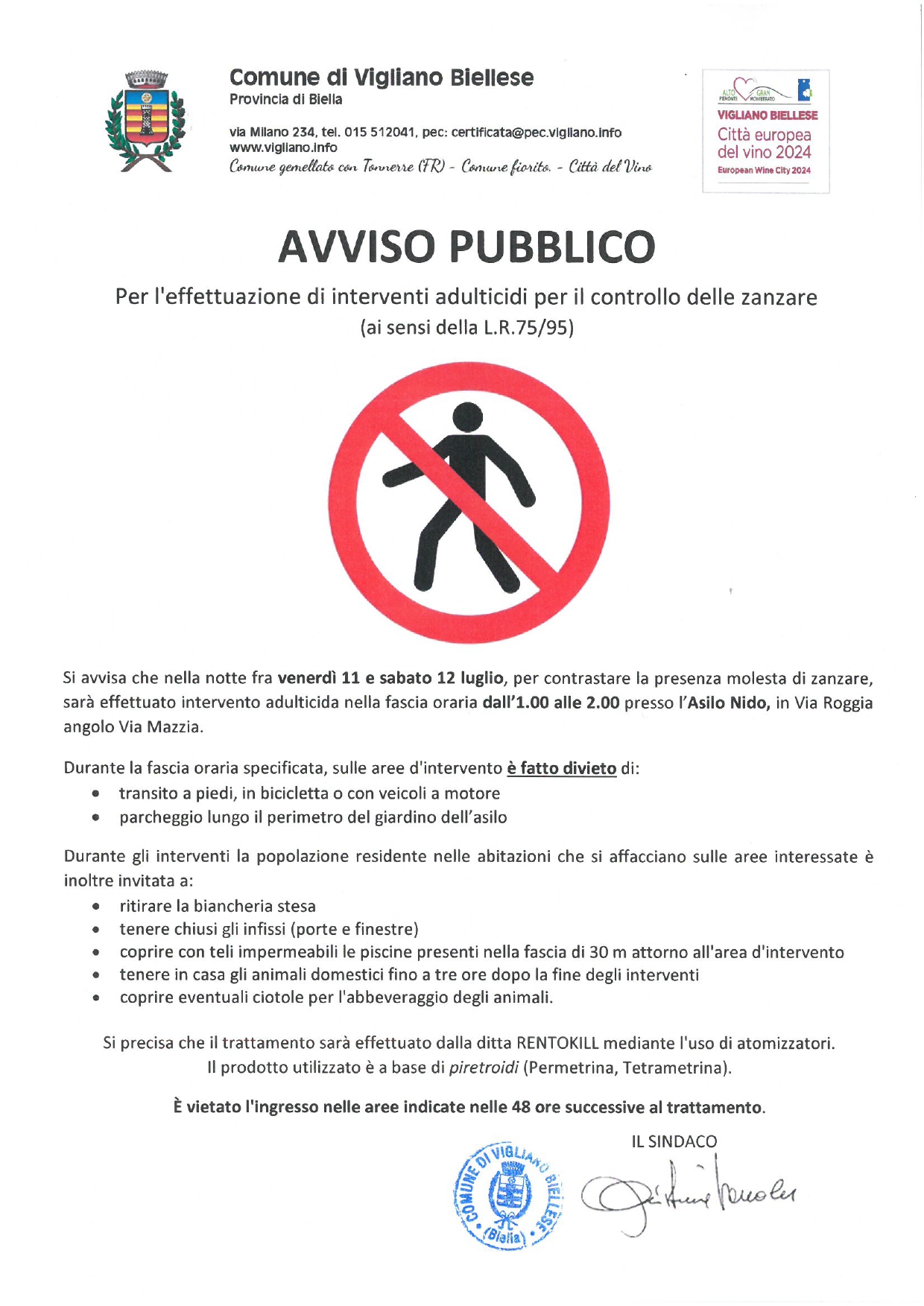 Nella notte fra venerdì 11 e sabato 12 luglio, nella fascia oraria dall'1.00 alle 2.00, presso l'ASILO NIDO in Via Roggia, angolo Via Mazzia, sarà effettuato un intervento straordinario adulticida per contrastare la presenza molesta di zanzare.