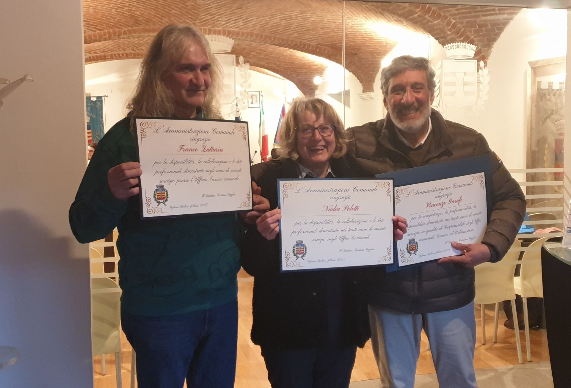 La seduta del Consiglio comunale dello scorso 27 febbraio si è aperta con il saluto a tre dipendenti comunali, da poco in pensione. Nadia Poletti, già in servizio nell'ambito amministrativo dell'Ufficio Tecnico; Vincenzo Garufi, Responsabile degli Uffici Tecnico e Urbanistica; Franco Zattarin, operatore tecnico. La Sindaca, Cristina Vazzoler, ha formulato a ciascuno un ringraziamento particolare, per la disponibilità e la competenza dimostrata negli anni di servizio.