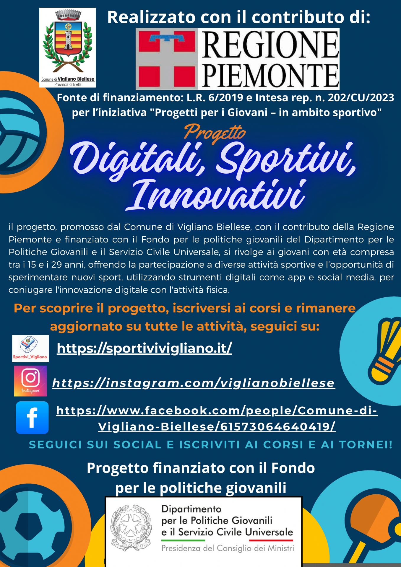Proseguono le attività dell’iniziativa "Digitali, Sportivi, Innovativi", progetto per la promozione dello sport per i più giovani, realizzato con il contributo della Regione Piemonte e finanziato con il Fondo per le politiche giovanili del Dipartimento per le Politiche Giovanili e il Servizio Civile Universale, indirizzato in via prioritaria ai giovani di età compresa tra i 15 e i 29 anni per favorire la partecipazione a diverse attività sportive.