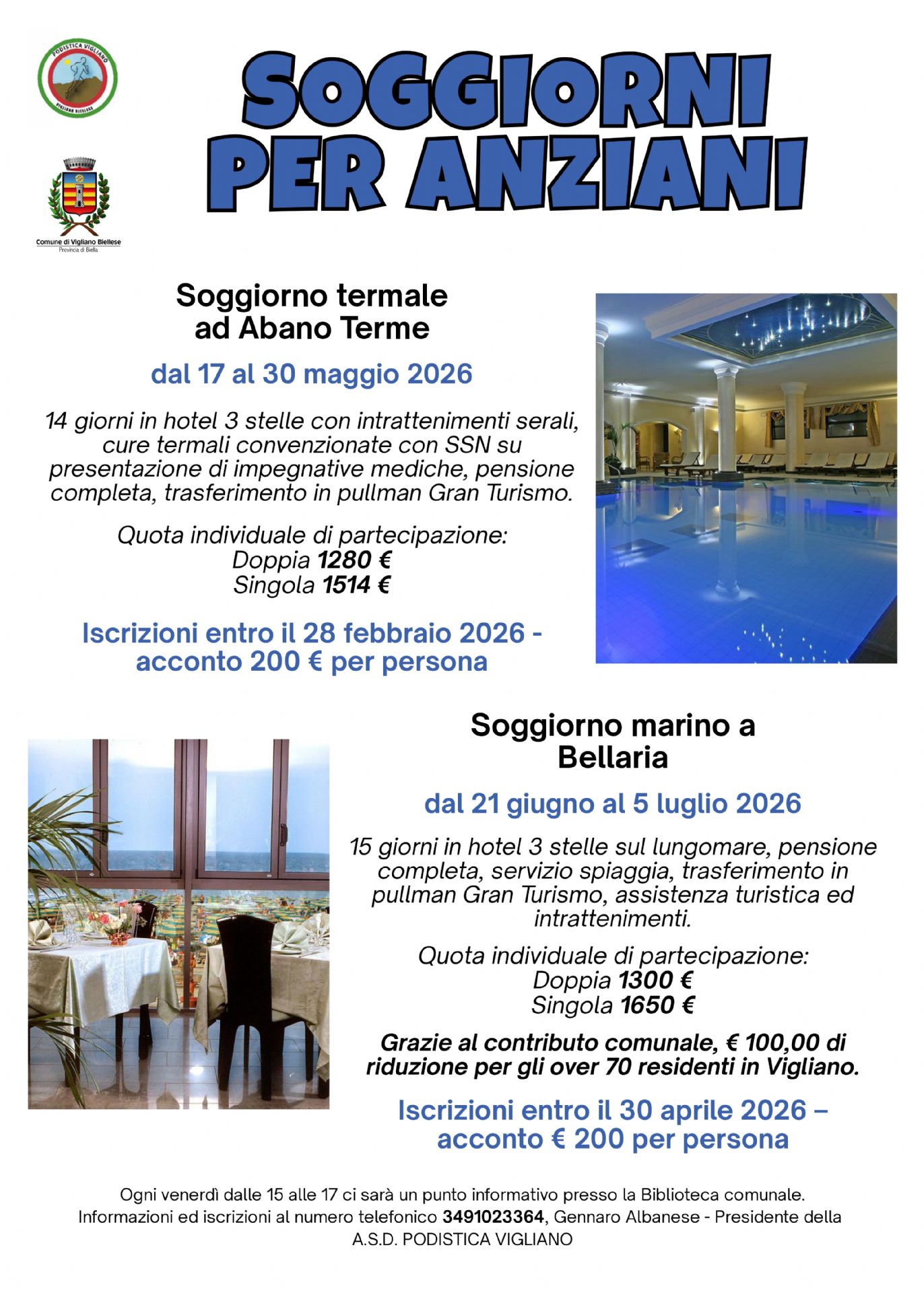 L'Associazione sportiva Podistica Vigliano, con il supporto dell’Amministrazione comunale, ha organizzato un programma di soggiorni dedicati, in particolare, alla popolazione anziana.
