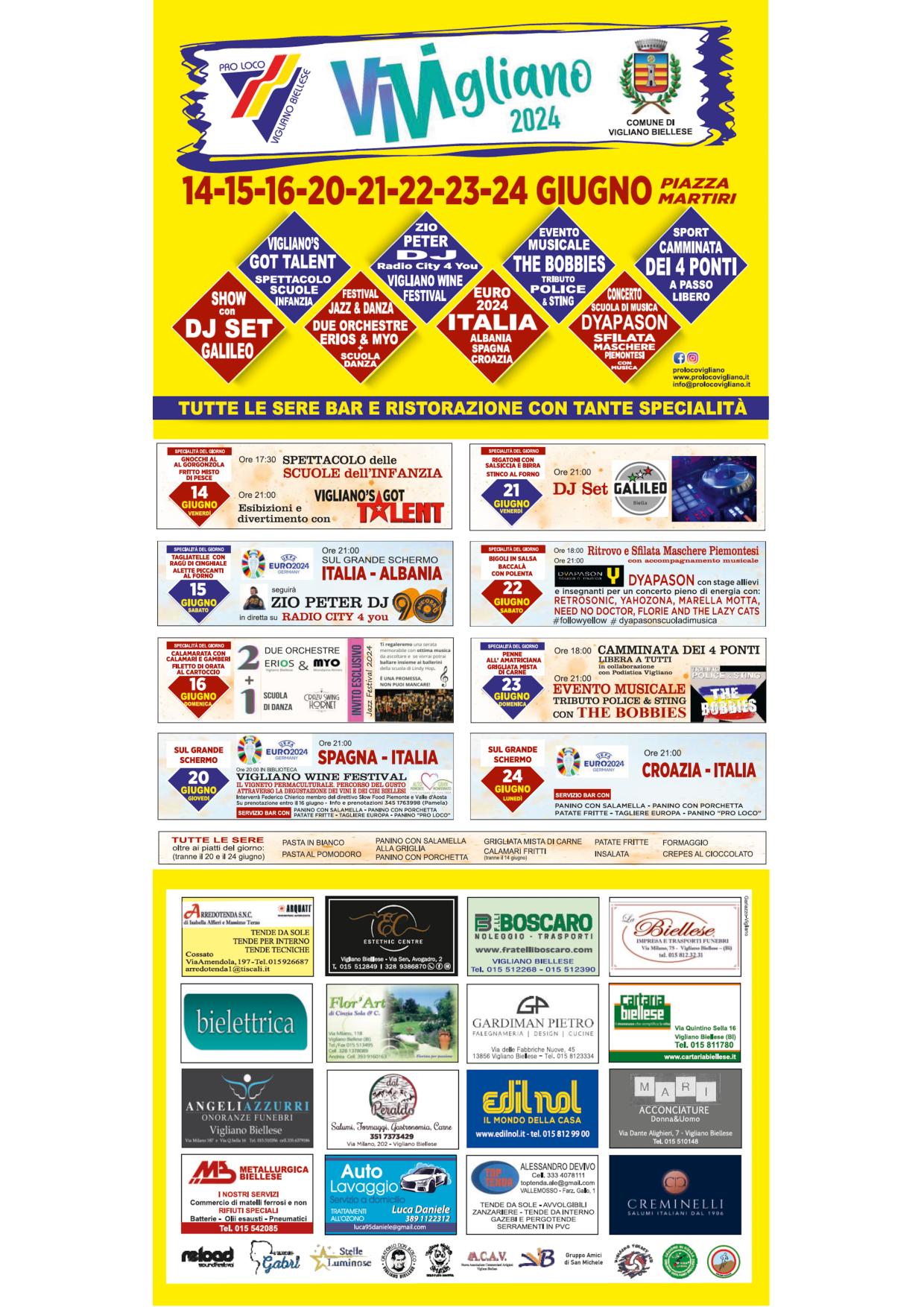 Da venerdì 14 giugno, ViVigliano 2024 è in piazza Martiri partigiani! Un programma intenso di serate musicali, di spettacoli, gare canore, specialità gastronomiche in due intensi fine settimana: da venerdì 14 a domenica 16 giugno e poi da giovedì 20 fino a lunedì 20 giugno... con un ritorno alla prima edizione di ViVigliano, quella del 2021, con gli Europei di calcio da guardare tutti insieme sul maxischermo, che prenderà il posto degli artisti sul palco nelle serata del 15, 20 e 24 giugno. Sabato 15, la partita sarà commentata da ZIO PETER DJ di Radio City che, in diretta da Vigliano, proseguirà poi la serata dopo la partita.