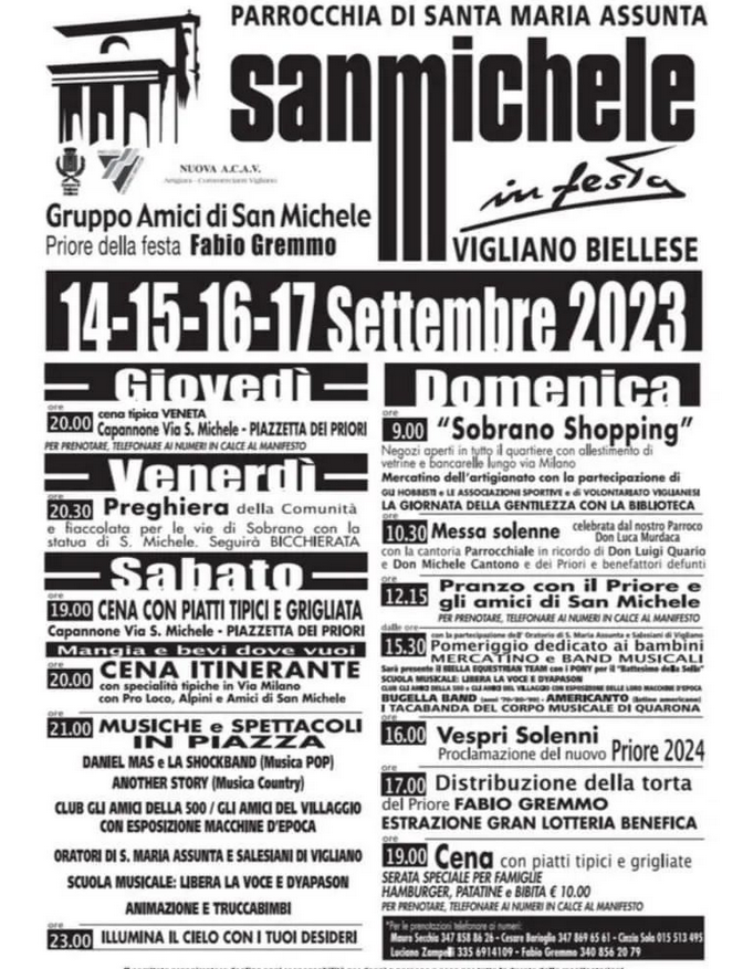 Dal 14 settembre (con il programma allegato), è festa a San Michele! Un appuntamento imperdibile per i Viglianesi. Prioritariamente perché affonda saldamente le radici nella devozione a San Michele, l’arcangelo che guida gli angeli contro Lucifero, e che rappresenta tutta la forza di opporsi al male che ogni comunità deve saper mantenere. Poi, perché questa devozione in ambito locale è legata ad un oratorio molto amato, e non solo da chi abita nella frazione di Sobrano: una chiesa curata e ben conservata in cui, anche nei periodi più difficili, gli appuntamenti domenicali sono sempre stati partecipati e condivisi.