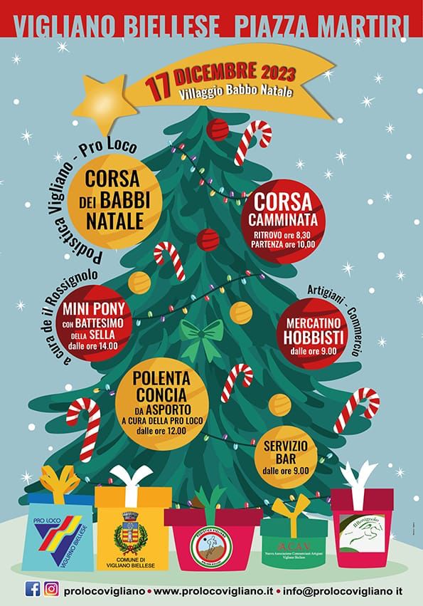 Di prima mattina, la manifestazione sportiva “Vigliano corre con Babbo Natale”, con la sua carica di Babbi Natale che correranno o cammineranno, comunque passeggiando per Vigliano, con quanti più bambini, passeggini, cagnolini e ospiti vari al seguito. Nel frattempo, anche la Piazza si animerà con il villaggio di Babbo Natale ed il mercatino, in cui si potranno trovare delle vere e proprie “chicche” per i regali di Natale più originali, fra cucito creativo, artigianato in legno, piccola gioielleria, bancherelle di vintage. I ragazzi degli Oratori saranno attivi per intrattenere i bambini con giochi e truccabimbi. Fin dal mattino, inoltre, il Gruppo Alpini sarà presente per rendere meno rigido il freddo di dicembre con il loro sempre apprezzato vin brulé. Alle 12, momento clou: la polenta concia preparata dalla Pro Loco, da asporto. Nel pomeriggio, Babbo Natale attenderà le letterine dei più piccoli e offrirà caramelle e dolci, mentre, dalle 14 in poi, la piazza profumerà di frittelle: grazie alla collaborazione di Gasthof che le cucinerà, calde, morbide e dolci. Frittelle che potranno accompagnarsi con la cioccolata calda che la Pro Loco renderà disponibile con altre bevande calde. Dalle 14, sempre per i piccoli, il battesimo della sella con i pony dell’azienda agricola Il Rosignolo di Buronzo. Ce n’è davvero per tutti i gusti e soprattutto ci sarà tanta voglia di stare insieme, di incontrarsi e di pensare insieme ad un Natale di pace e ad un nuovo anno pieno di speranza. Domenica 17 dicembre, a Vigliano, è già Natale: non potete mancare!