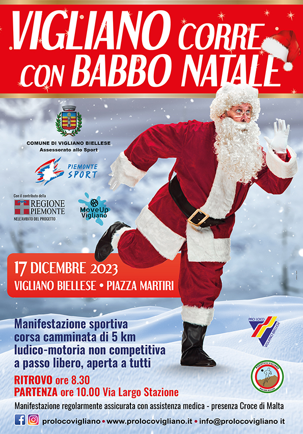 Domenica 17 dicembre, Vigliano corre con Babbo Natale! La manifestazione, dopo le passate e partecipate edizioni, prevede come sempre una corsa e camminata ludico-motoria di 5 km a passo libero per le vie del paese, aperta a tutti, in cui i partecipanti sono vestiti (ma senza obbligo!) da “babbo Natale”.