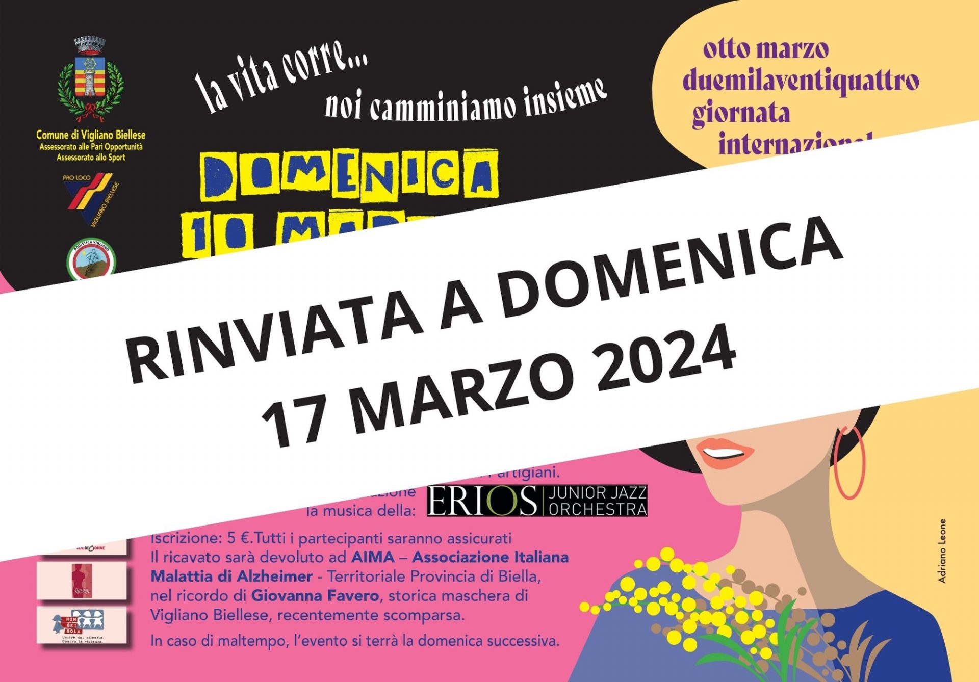 «Invitiamo tutti a partecipare a questa camminata – dice il Sindaco, Cristina Vazzoler - che include finalità di benessere psico fisico e inviti alla riflessione. Questa passeggiata è un gesto semplice, quotidiano e salutare, per ripensare al senso della giornata internazionale della Donna: le conquiste sociali, politiche ed economiche delle donne non sono tali in molte parti del mondo ed anche nel nostro civile Occidente assistiamo quotidianamente ad episodi di discriminazione, violenze e femminicidi. Camminare “insieme”, donne e uomini fianco a fianco, ha quindi un profondo significato: operare affinché siamo tutti capaci di relazioni sempre più consapevoli, paritarie, ponderate e lontane da ogni forma di sopraffazione. Anche quest’anno, vogliamo dedicare il ricavato della manifestazione ad una causa benefica: il supporto ad AIMA – Associazione italiana malattia di Alzheimer – in ricordo di Giovanna Favero, storica maschera di Vigliano Biellese, recentemente scomparsa.»
