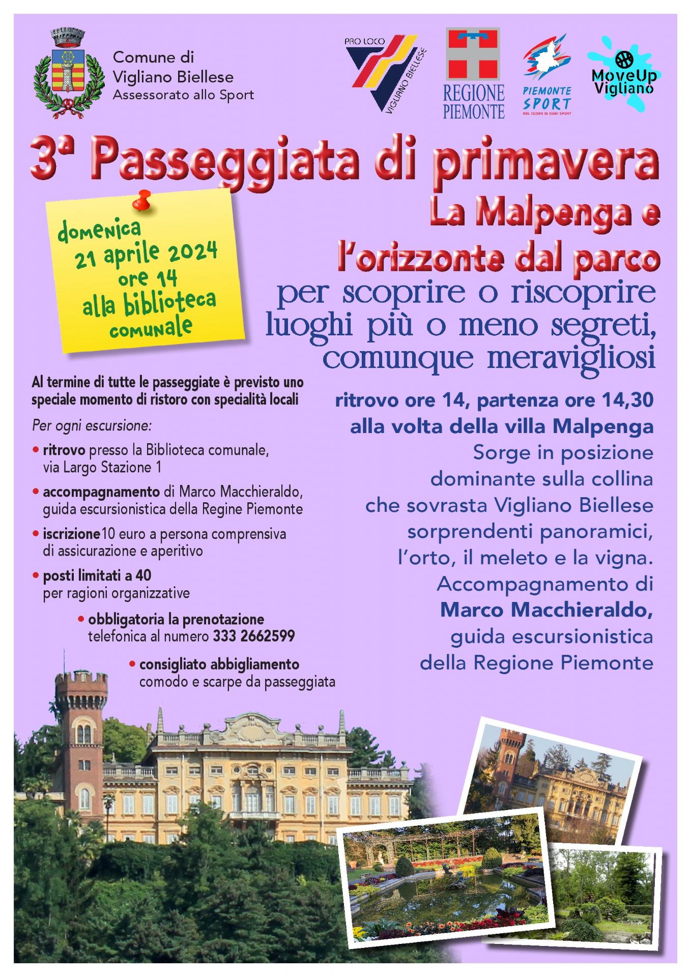 Dopo i due itinerari mattutini, alla volta del Castello di Montecavallo e del "giro dell'acqua", le passeggiate di primavera divengono pomeridiane: il terzo appuntamento prevede il ritrovo alle ore 14, sempre presso la Biblioteca comunale, con partenza alle 14.30 alla volta di Villa Malpenga con un percorso in collina, per guardare l'orizzonte dallo splendido parco della Villa.