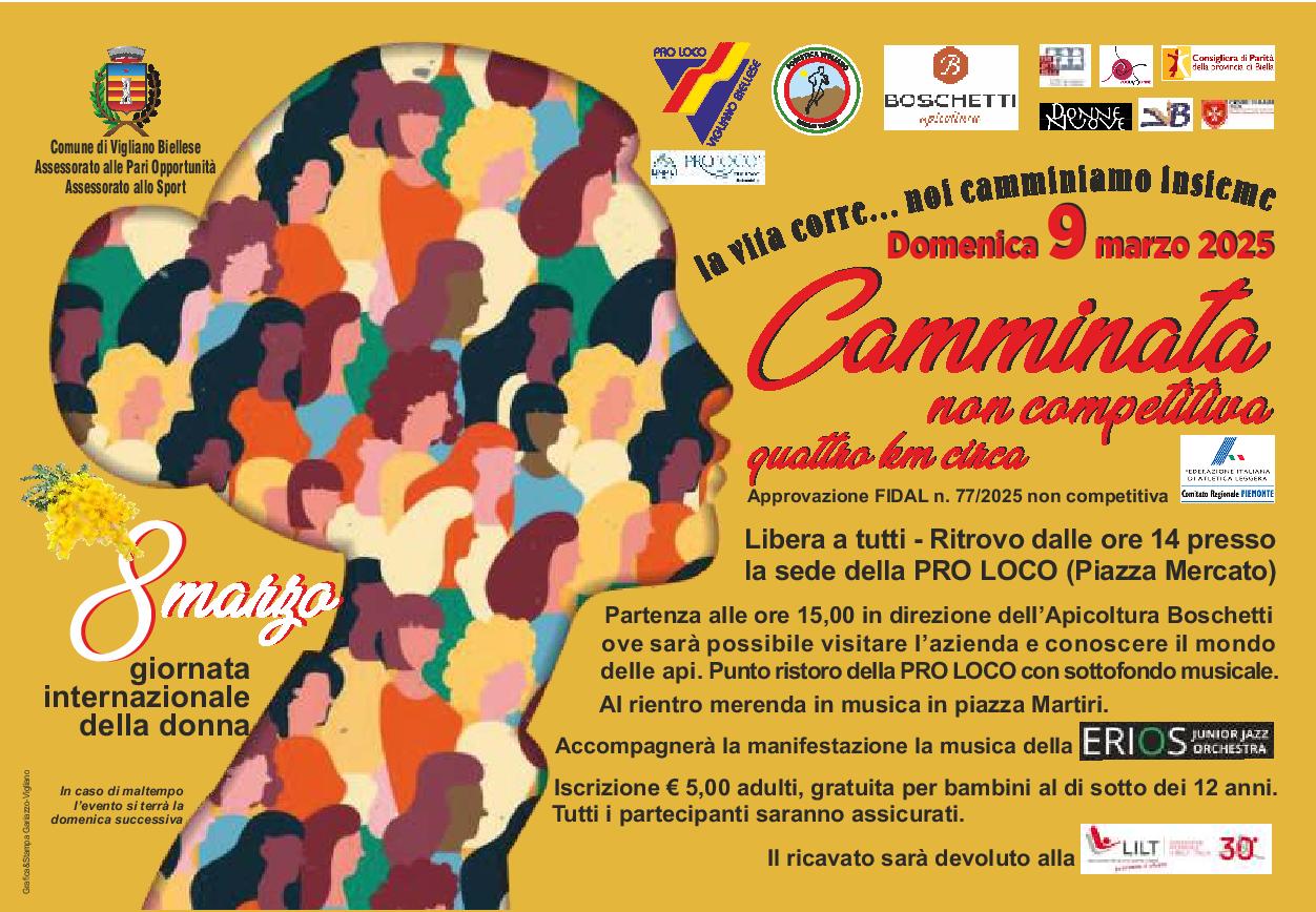 Per la Giornata internazionale della Donna, gli Assessorati alle Pari opportunità e allo Sport del Comune propongono, come è tradizione, la manifestazione La vita corre… noi camminiamo insieme, che si terrà nel pomeriggio di domenica 9 marzo 2025, con ritrovo alle 14 e partenza alle ore 15 di fronte alla sede della Pro Loco.