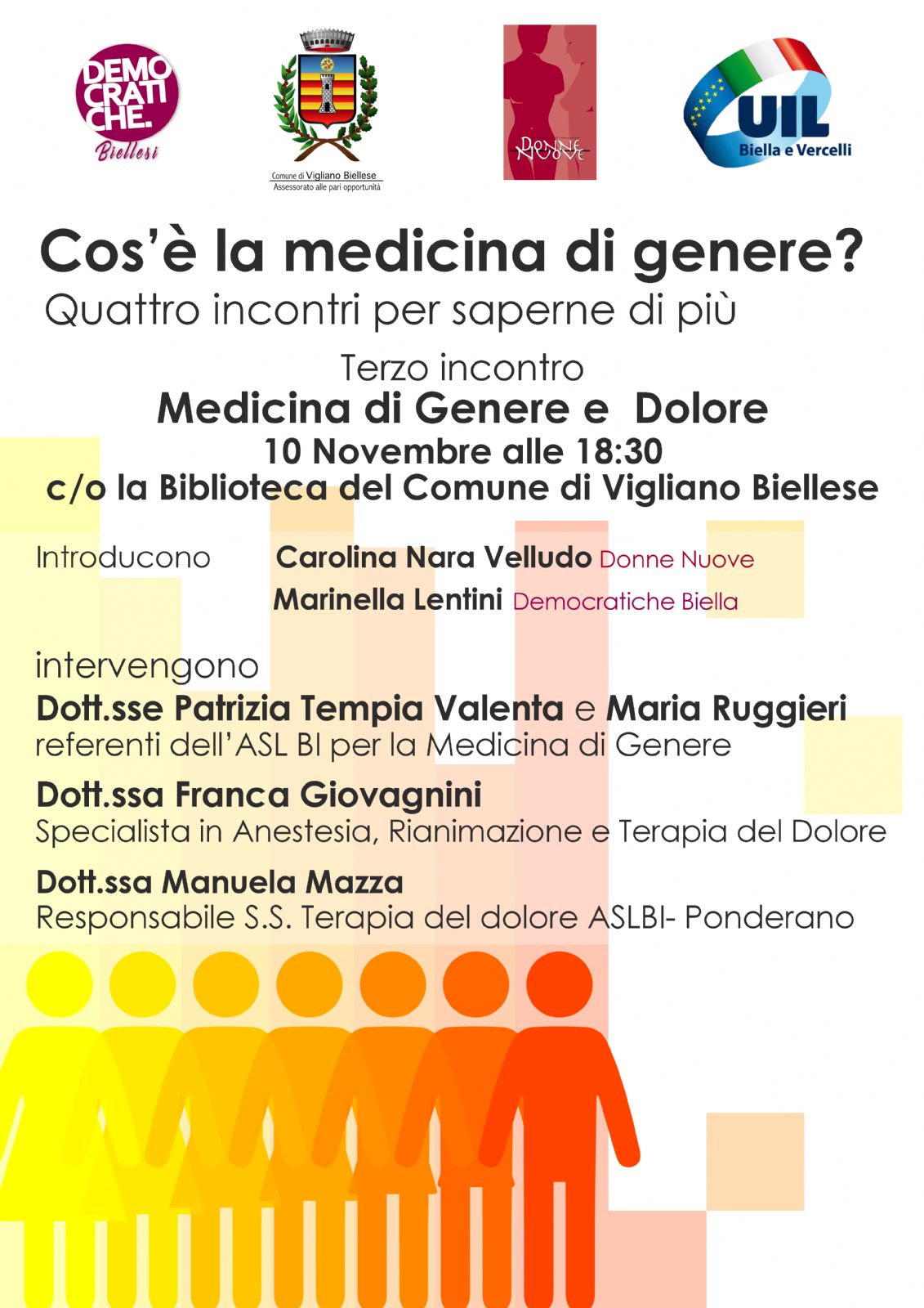 E' fissato per le ore 18.30 di giovedì 10 novembre 2022, nella biblioteca comunale "Aldo Sola", l'incontro sul tema "Medicina di genere e dolore". Interverranno la dott.ssa Patrizia Tempia Valenta e la dott.ssa Maria Ruggieri, referenti dell'ASL di Biella per la medicina di genere; la dott.ssa Franca Giovagnini, specialista in anestesia, rianimazione e terapia del dolore e la dott.ssa Manuela Mazza, responsabile s.s. terapia del dolore presso l'ASL di Biella. L'introduzione sarà tenuta da Carolina Nara Velludo dell'Associazione Donne Nuove e da Marinella Lentini, Democratiche Biellesi.