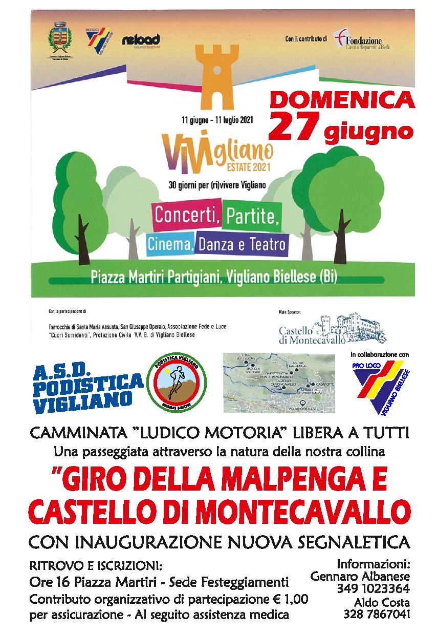 Nell'ambito di ViVigliano 2021, l'ASD Podistica Vigliano in collaborazione con l'Associazione Turistica Pro Loco di Vigliano Biellese, organizza una camminata ludico motoria libera a tutti, una passeggiata attraverso la natura della collina viglianese: Giro della Malpenga e Castello di Montecavallo, con inaugurazione nuova segnaletica.