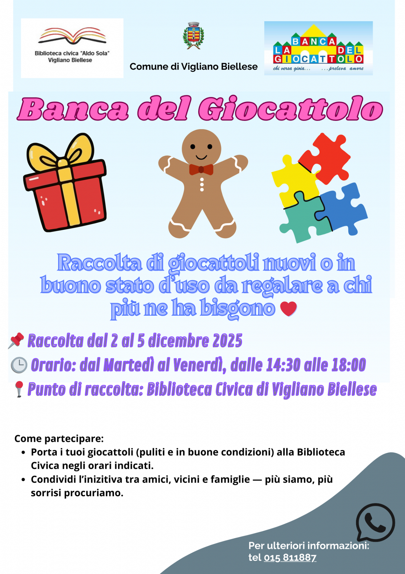Anche quest’anno il Comune di Vigliano Biellese promuove l’iniziativa benefica la “Banca del Giocattolo”, un’iniziativa dedicata alla raccolta di giocattoli da destinare ai bambini e alle famiglie del territorio che vivono un periodo di difficoltà.