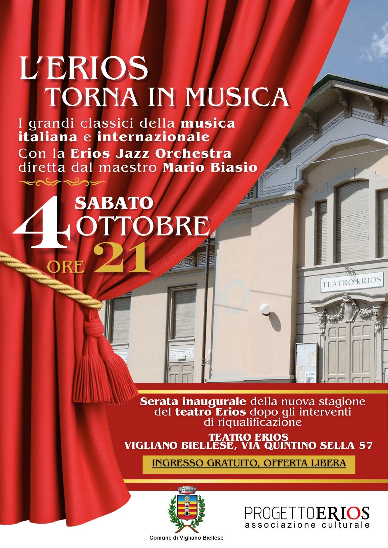 L'Amministrazione comunale, con l'Associazione Progetto Erios ha voluto festeggiare questa attesa occasione con un concerto con i grandi classici della musica internazionale e italiana, che sarà la Erios Jazz Orchestra a proporci.