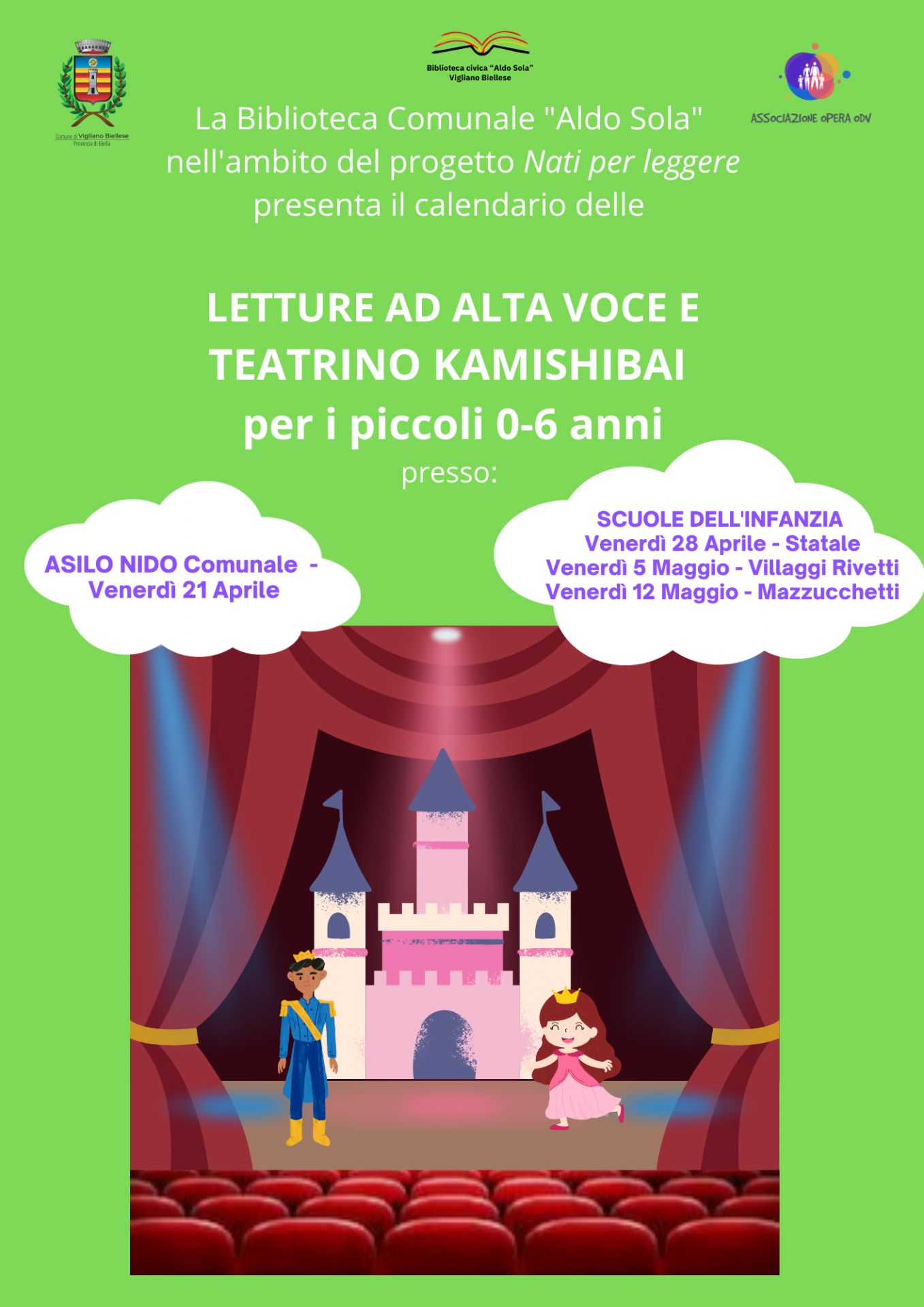 Anche per quest’anno la Biblioteca Civica “Aldo Sola” di Vigliano B.se, nell’ambito del progetto nazionale “Nati per leggere” presenta il calendario delle letture ad alta voce e teatrino Kamishibai dedicato ai bambini da 0 a 6 anni.