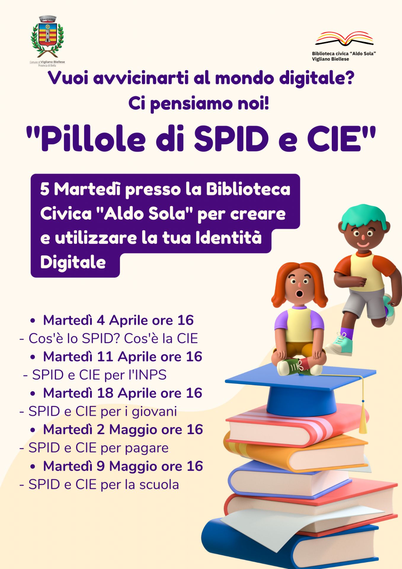 La Biblioteca comunale “Aldo Sola” di Vigliano Biellese, grazie al progetto di Servizio Civile Digitale, ha organizzato 5 incontri “Pillole di Spid & Pillole di CIE” in cui, in modo semplice e rivolto a tutti – ma proprio a tutti! – la volontaria del Servizio Civile, Camilla, spiegherà le funzioni dell’identità digitale per accedere ai portali della pubblica amministrazione.