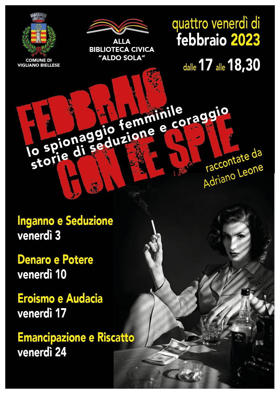 Saranno le spie le protagoniste dei quattro venerdì del mese di febbraio in biblioteca: a parlarcene sarà Adriano Leone. «Quella dello spionaggio femminile – spiega il relatore - è una storia di seduzione e di coraggio avara di documentazione e, per questo, ancora poco studiata. E, d’altra parte, una spia abitualmente non tiene un diario; casomai in alcuni rari casi pubblica un’autobiografia, decenni dopo la sua esperienza di agente segreto, sempre che sia sopravvissuta.»