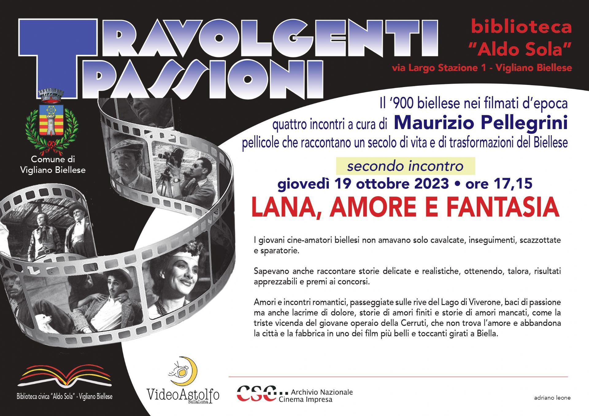 Giovedì 19 ottobre 2023, alle ore 17.15, la Biblioteca comunale ospita il secondo incontro del ciclo "Travolgenti passioni - Il Novecento biellese nei filmati d'epoca", a cura di Maurizio Pellegrini. Il titolo "Lana, amore e fantasia" suggerisce immediatamente un nesso fra il mondo del tessile e quello del cinema.