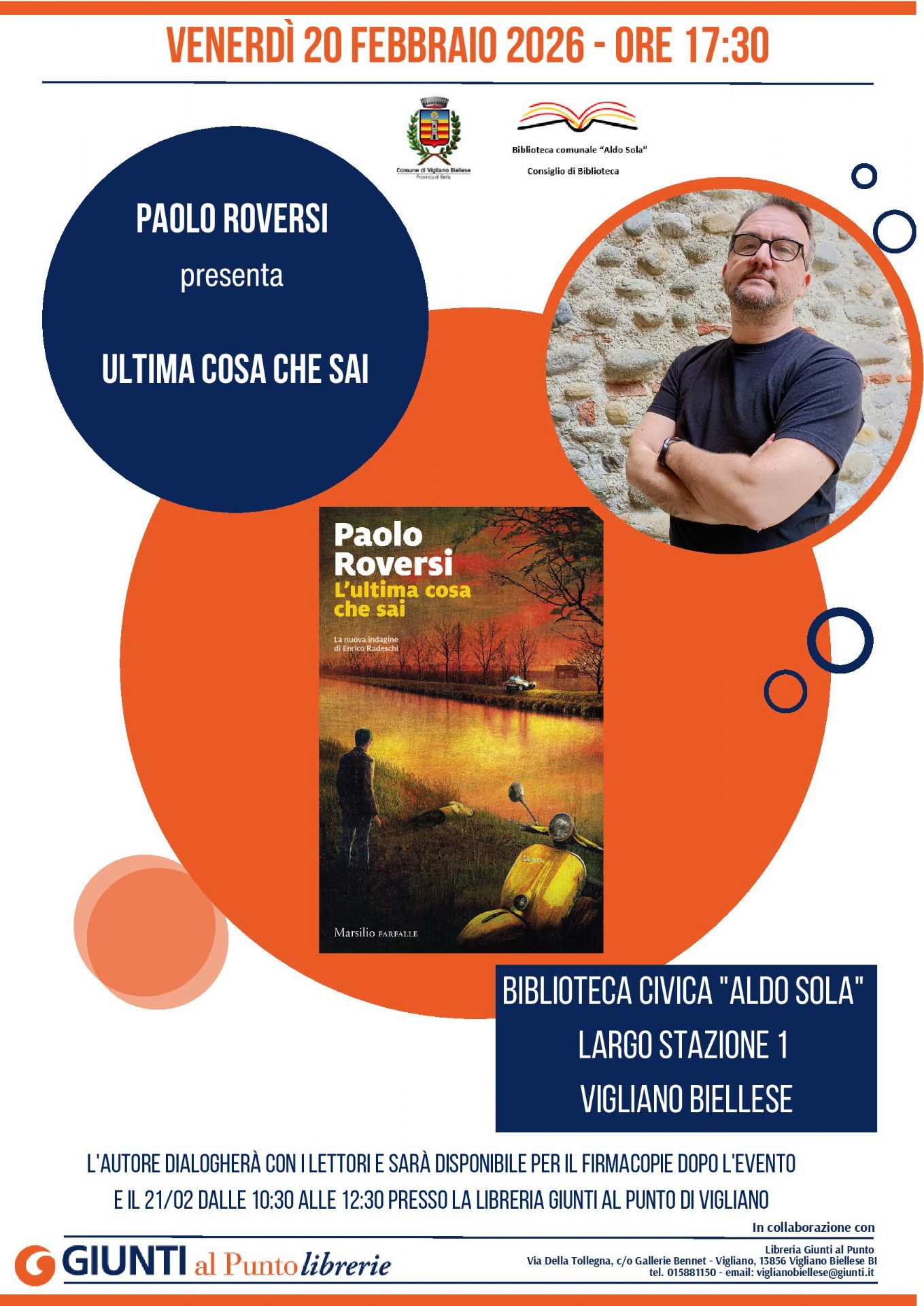 Venerdì 20 febbraio, alle 17.30, la Biblioteca comunale ospiterà lo scrittore Paolo Roversi, che presenterà il suo ultimo libro "L'ultima cosa che sai - La nuova indagine di Enrico Radeschi". L'evento è organizzato in collaborazione con la Libreria Giunti al Punto di Vigliano Biellese.
