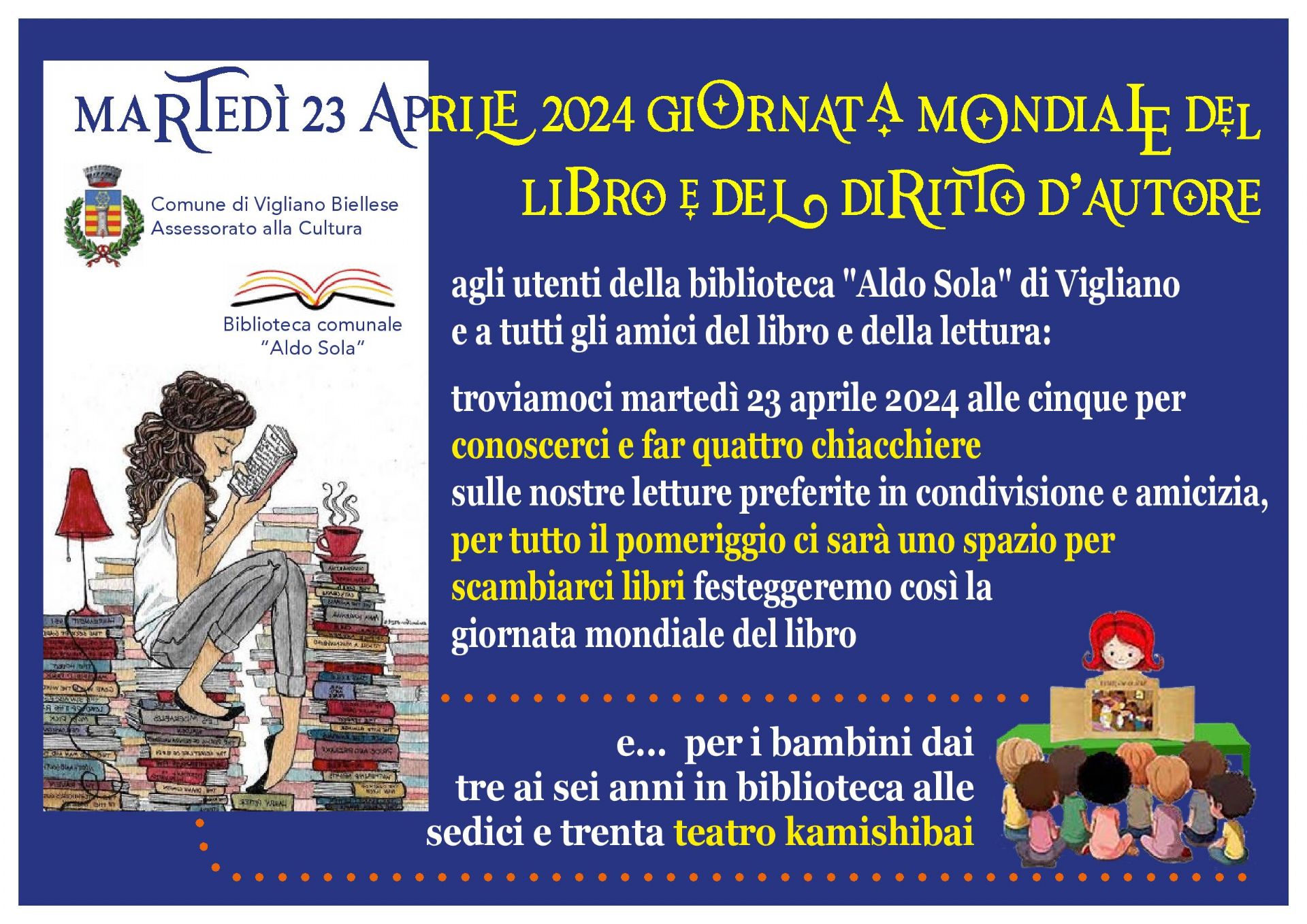Ogni anno il 23 aprile ricorre la Giornata Mondiale del libro e del diritto d'autore: un'occasione per ribadire l'importanza della lettura, fonte di crescita personale, di sviluppo della creatività e di conoscenza del mondo che ci circonda. Martedì 23 aprile 2024, la biblioteca "Aldo Sola" invita tutti gli amici del libro e della lettura ad un momento di incontro: alle cinque del pomeriggio, per "fare quattro chiacchiere sulle nostre letture preferite in condivisione ed amicizia".
