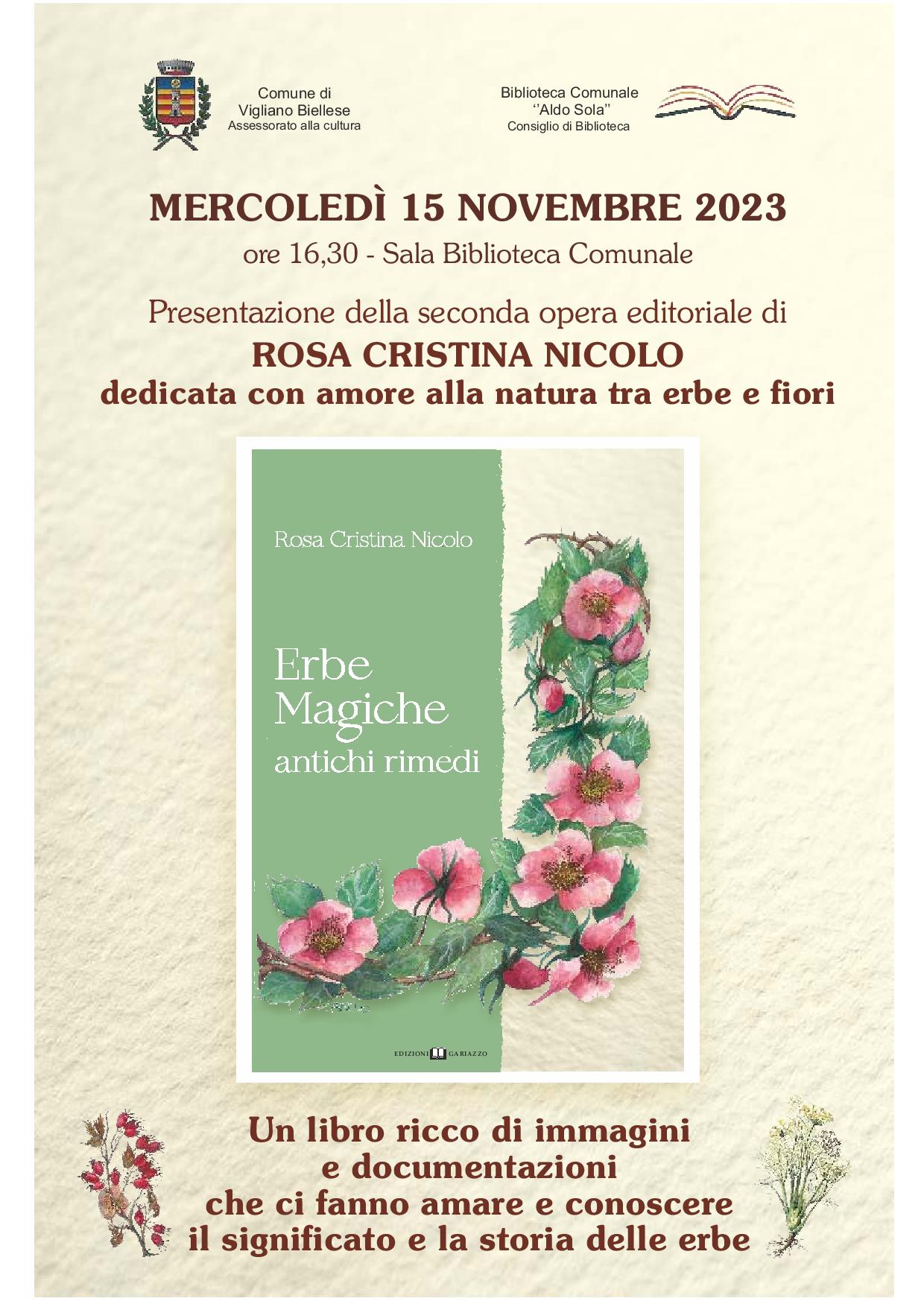 Mercoledì 15 Novembre alle ore 16,30 la Biblioteca ospiterà Rosa Cristina Nicolo con il suo libro "Erbe Magiche: antichi rimedi", una raccolta ampia e documentata sulle erbe spontanee, utili in cucina e a scopo curativo, che l’autrice ha raccolto durante tanti anni di escursioni in tutto il Piemonte e la Valle D’Aosta.