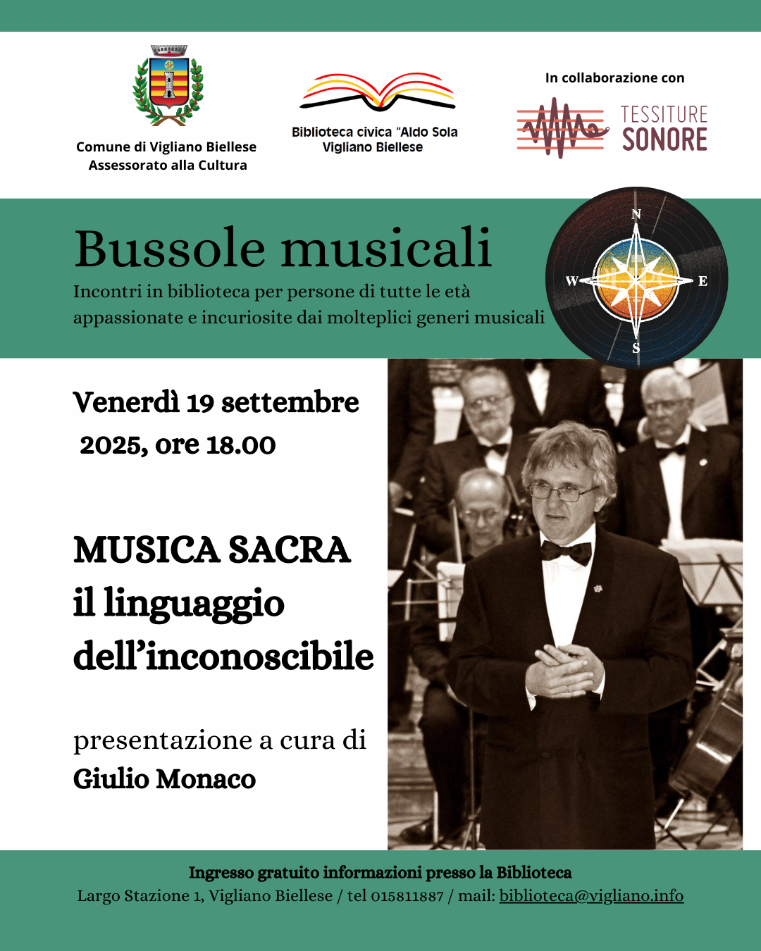 Venerdì 19 settembre alle ore 18,00, nell’ambito del progetto “Bussole musicali”, la Biblioteca comunale ospiterà il maestro Giulio Monaco, direttore corale, diplomato presso il conservatorio “G. Verdi” di Milano, attualmente presidente del comitato artistico della Associazione Cori Piemontesi, membro eletto della Commissione Artistica della Federazione Corale Nazionale e direttore artistico della collana discografica Musica e Musicisti Biellesi.