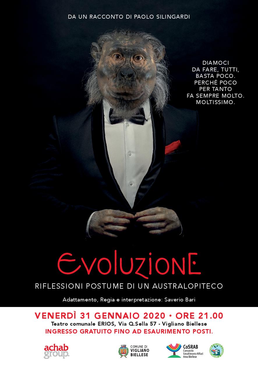 Venerdì 31 gennaio, alle ore 21.00, andrà in scena al teatro Erios la prima nazionale di “Evoluzione. Riflessioni postume di un Australopiteco.”