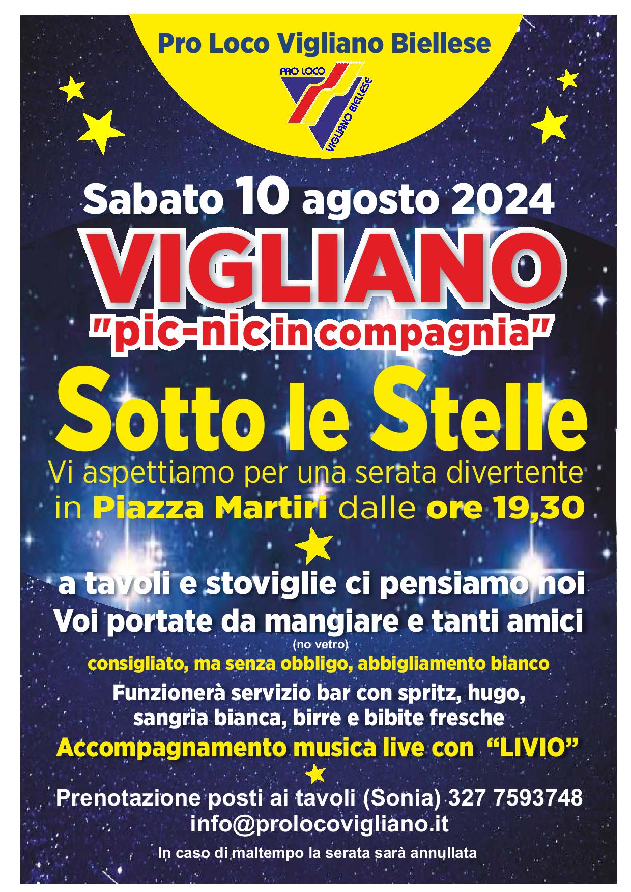 E' fissato per sabato 10 Agosto, dalle ore 19.30, il Pic nic sotto le stelle che l'Associazione turistica Pro Loco di Vigliano Biellese ha organizzato in piazza Martiri partigiani. Come di consuetudine, la formula richiede di portare da casa il cibo, mentre la Pro Loco penserà al resto, preparando con cura i tavoli e rendendo disponibile il servizio bar con bibite fresche e cocktail estivi, appositamente scelti per l'occasione. Non mancherà l'accompagnamento musicale, per guardare il cielo stellato immersi in una adeguata atmosfera. Consigliato, senza obbligo, l'abbigliamento bianco.
