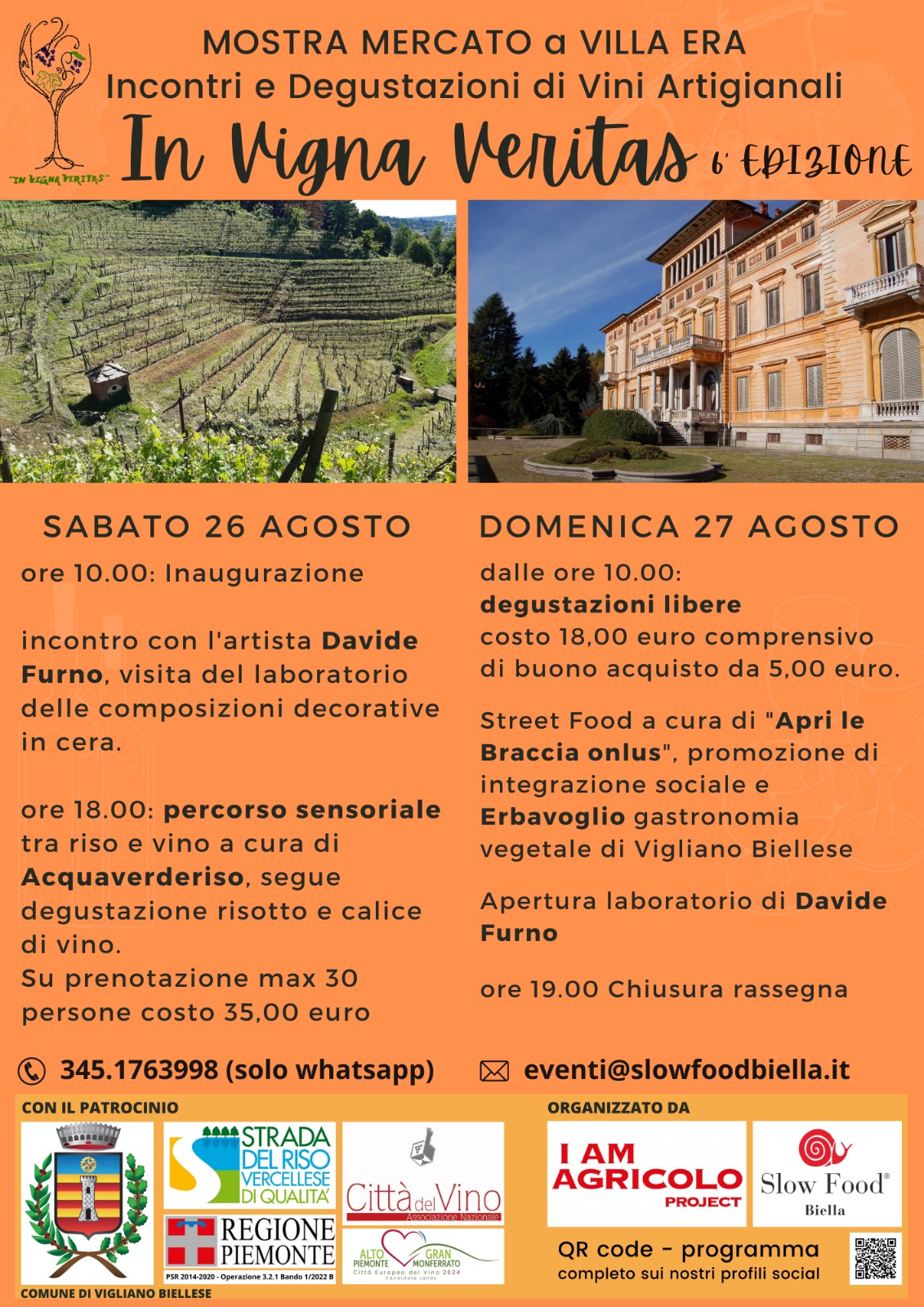 Anche quest'anno, puntuale per l'ultimo fine settimana di agosto, "I am agricolo project" e "Slow Food Biella" presentano a Villa Era la sesta edizione della rassegna "In Vigna Veritas", mostra mercato con incontri e degustazioni di vini artigianali, arricchita da incontri con l'arte e percorsi sensoriali fra gastronomia, agricoltura sostenibile e progetti di integrazione sociale.
