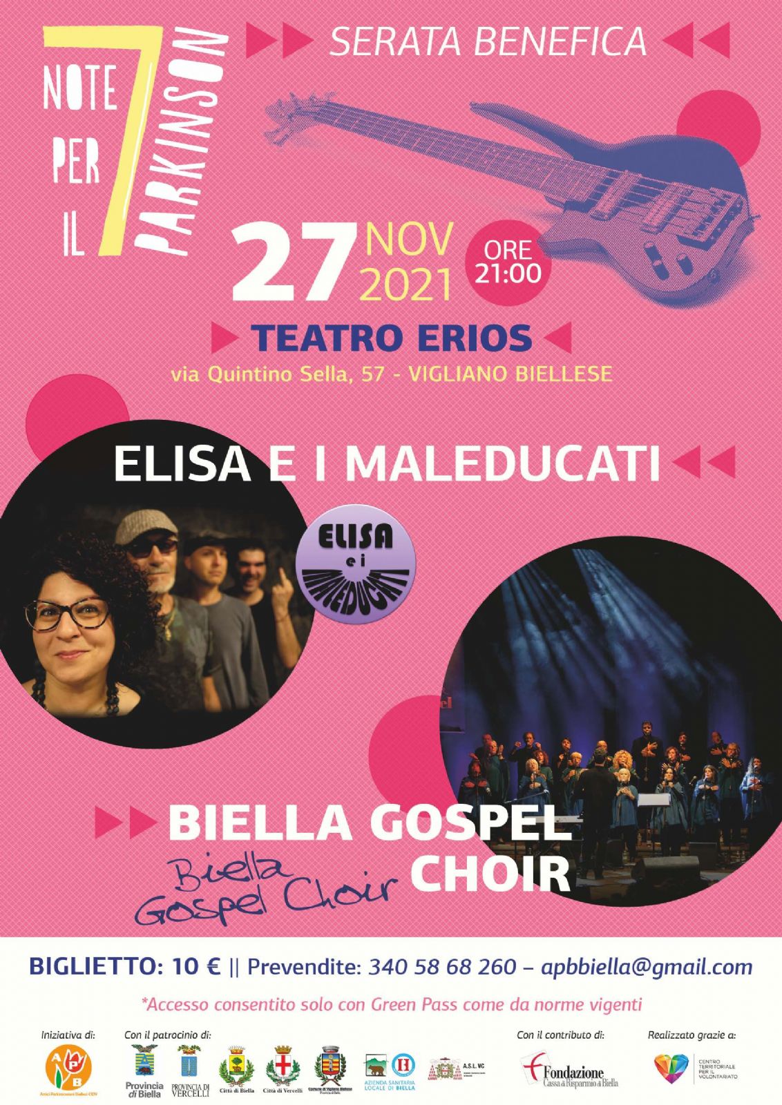 Sabato 27 novembre 2021, alle ore 21.00, al Teatro Erios, si terrà lo spettacolo benefico "7 note per il Parkinson" organizzato dall'Associazione AMICI PARKINSONIANI BIELLESI ODV con il patrocinio del Comune di Vigliano Biellese. Il concerto, che vedrà l'esibizione di Elisa e i maleducati e del Biella Gospel Choir, è parte dell'iniziativa "Una Settimana per Il Parkinson", finalizzata alla sensibilizzazione, informazione e raccolta fondi a sostegno delle attività promosse dall'organizzazione di volontariato APB in favore dei malati di Parkinson e loro familiari/caregiver delle province di Biella e Vercelli.