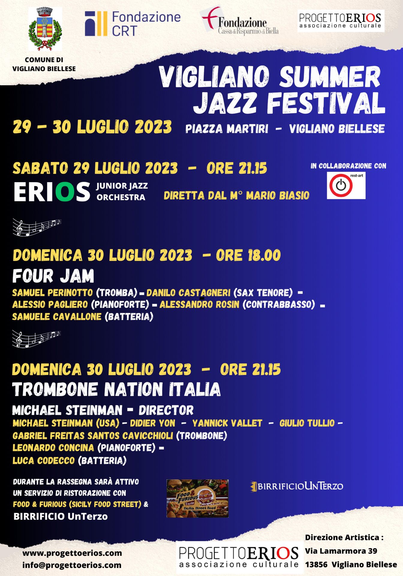 Domenica 30 luglio, un doppio appuntamento: alle ore 18.00 con i giovani e bravissimi jazzisti di "Four Jam"; capitanati dal talentuoso trombettista Samuel Perinotto; alle ore 21.15 con una formazione inedita "Trombone Nation Italia", diretta da Michael Steinman, trombonista americano che a Vigliano Biellese ha già calcato il palco del teatro Erios con i ragazzi della EJJO e che ora torna a dirigere cinque giovani trombonisti - Didier Yon, Yannik Vallet, Giulio Tullio, Gabriel Freitas Santos Cavicchioli, accompagnati dal piano di Leonardo Concina e con la batteria di Luca Codecco.