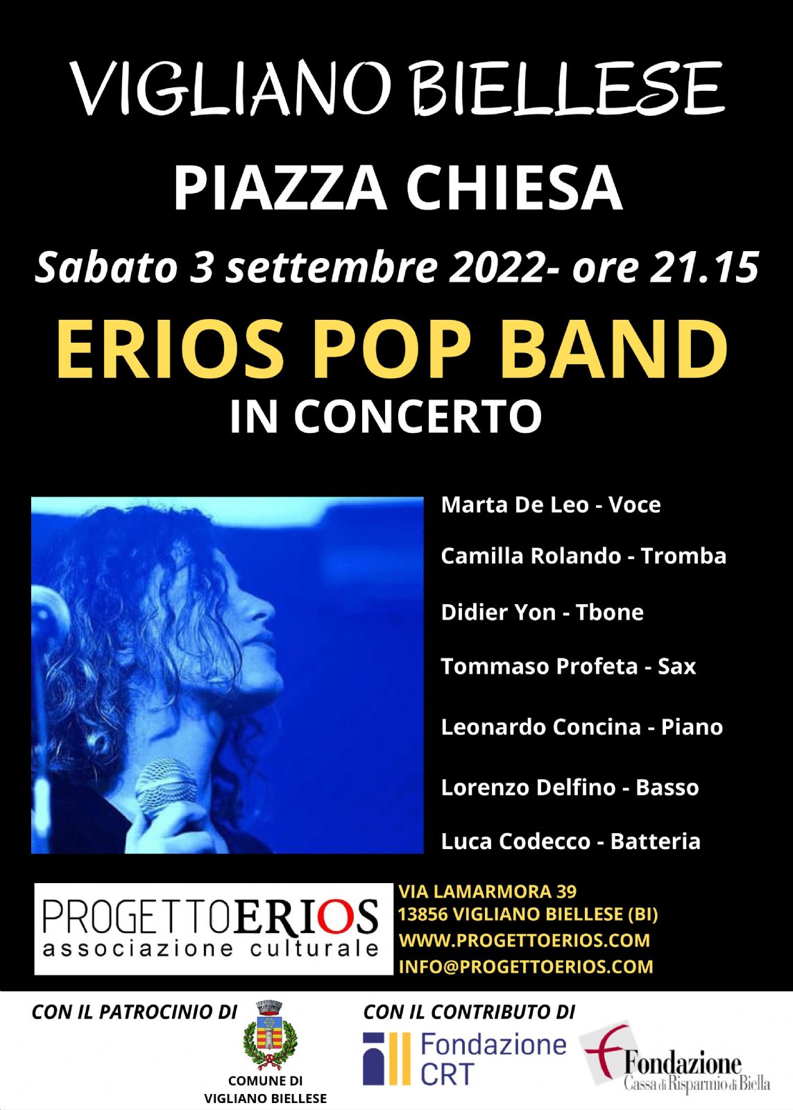 Nell'ambito della festa patronale di Santa Maria Assunta, sabato 3 settembre, alle ore 21.15, la Erios pop band si esibirà con un repertorio che riproporrà grandi classici della canzone italiana, oltre a melodie internazionalmente note e conosciute. I 7 elementi sul palco sono alcuni dei più noti e apprezzati musicisti formatisi in seno alla Erios Junior Jazz Orchestra: Marta De Leo - Voce; Didier Yon - Tbone; Camilla Rolando - Tromba; Tommaso Profeta - Sax; Leonardo Concina - Piano; Lorenzo Delfino - Basso; Luca Codecco - Batteria.