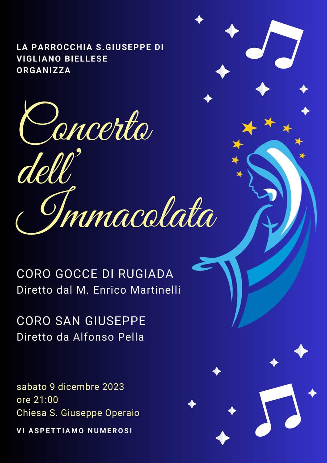 Sabato 9 dicembre alle ore 21.00 la Parrocchia San Giuseppe Operaio di Vigliano Biellese invita tutti al Concerto dell'Immacolata.