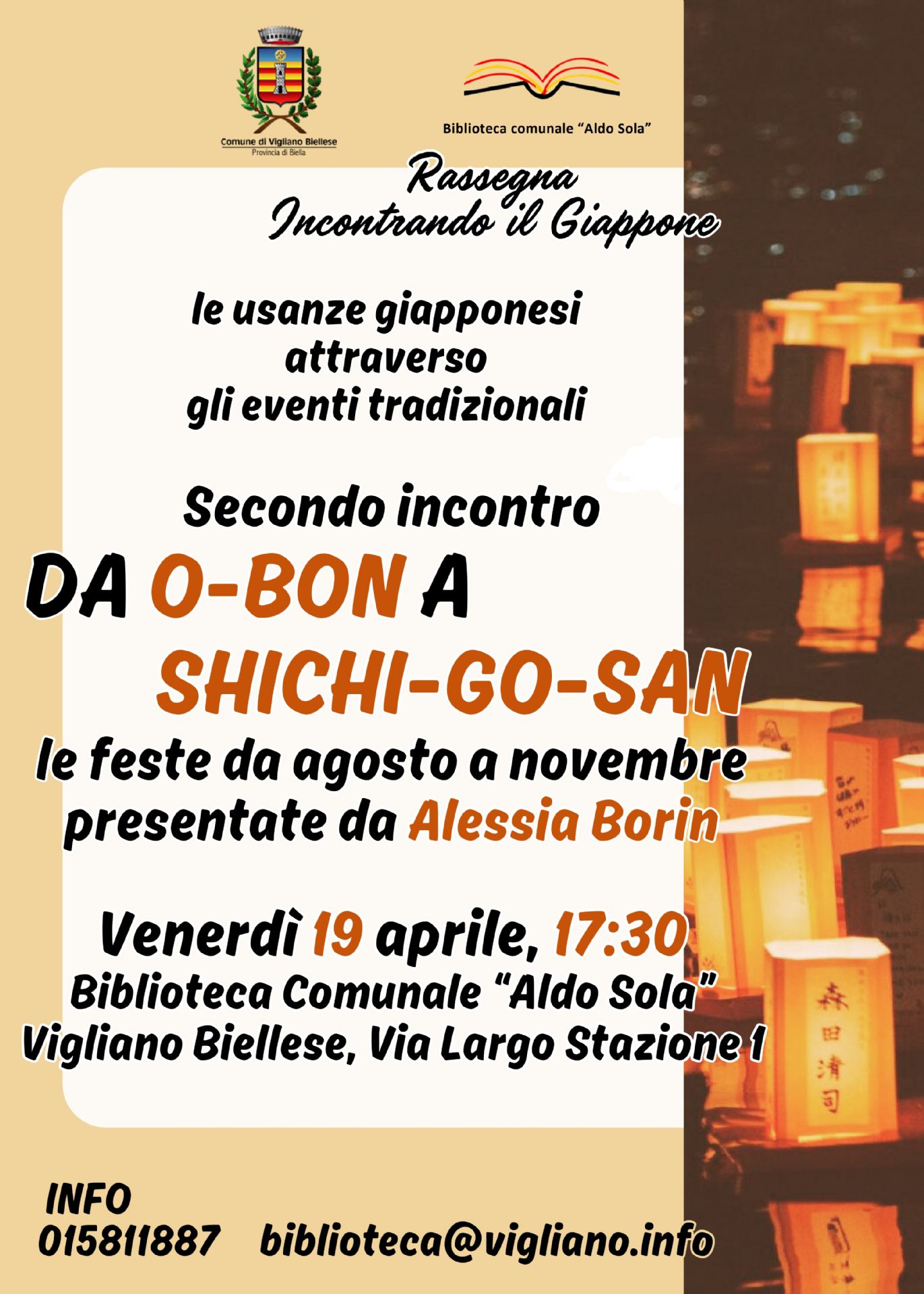 Venerdì 19 aprile, alle ore 17,30 la Biblioteca comunale ospiterà Alessia Borin, laureata in lingue e civiltà dell‘Asia e dell‘Africa presso l‘Università degli Studi di Torino, per il secondo dei tre incontri dedicati alle usanze tradizionali giapponesi attraverso le feste annuali, organizzati nell’ambito di “Incontrando il Giappone”, la rassegna di appuntamenti in Biblioteca per avvicinarsi in punta dei piedi al paese del Sol Levante. Da O-BON a SHICHI-GO-SAN è il titolo dell’incontro, quindi dal mese di agosto per onorare gli spiriti degli antenati fino alla festa dei bambini e delle bambine.