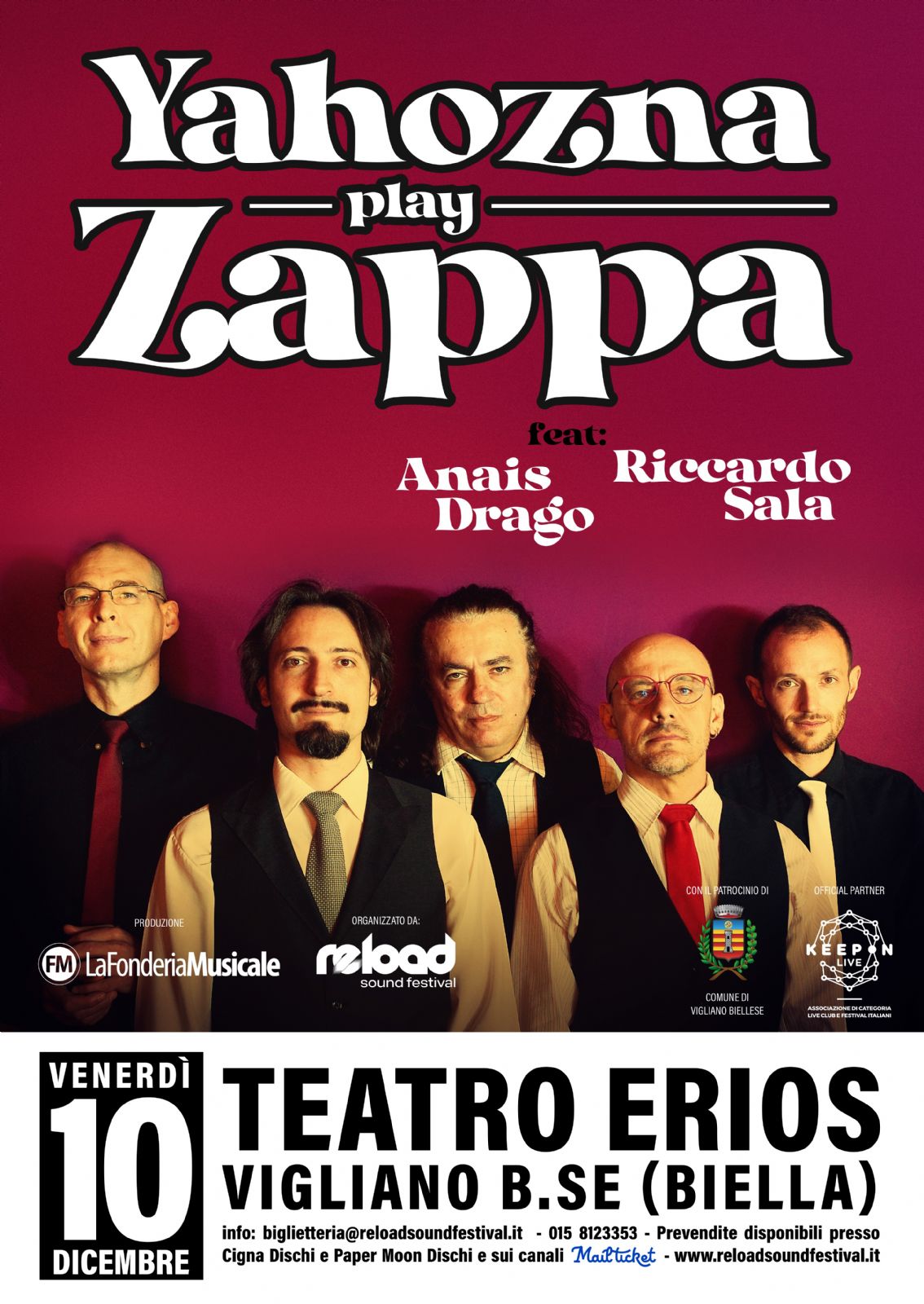 Venerdì 10 dicembre, alle ore 21.00, al teatro Erios Yahozna play Zappa: torna la musica dal vivo in teatro grazie a una produzione de La Fonderia Musicale e al supergruppo biellese Yahozna.