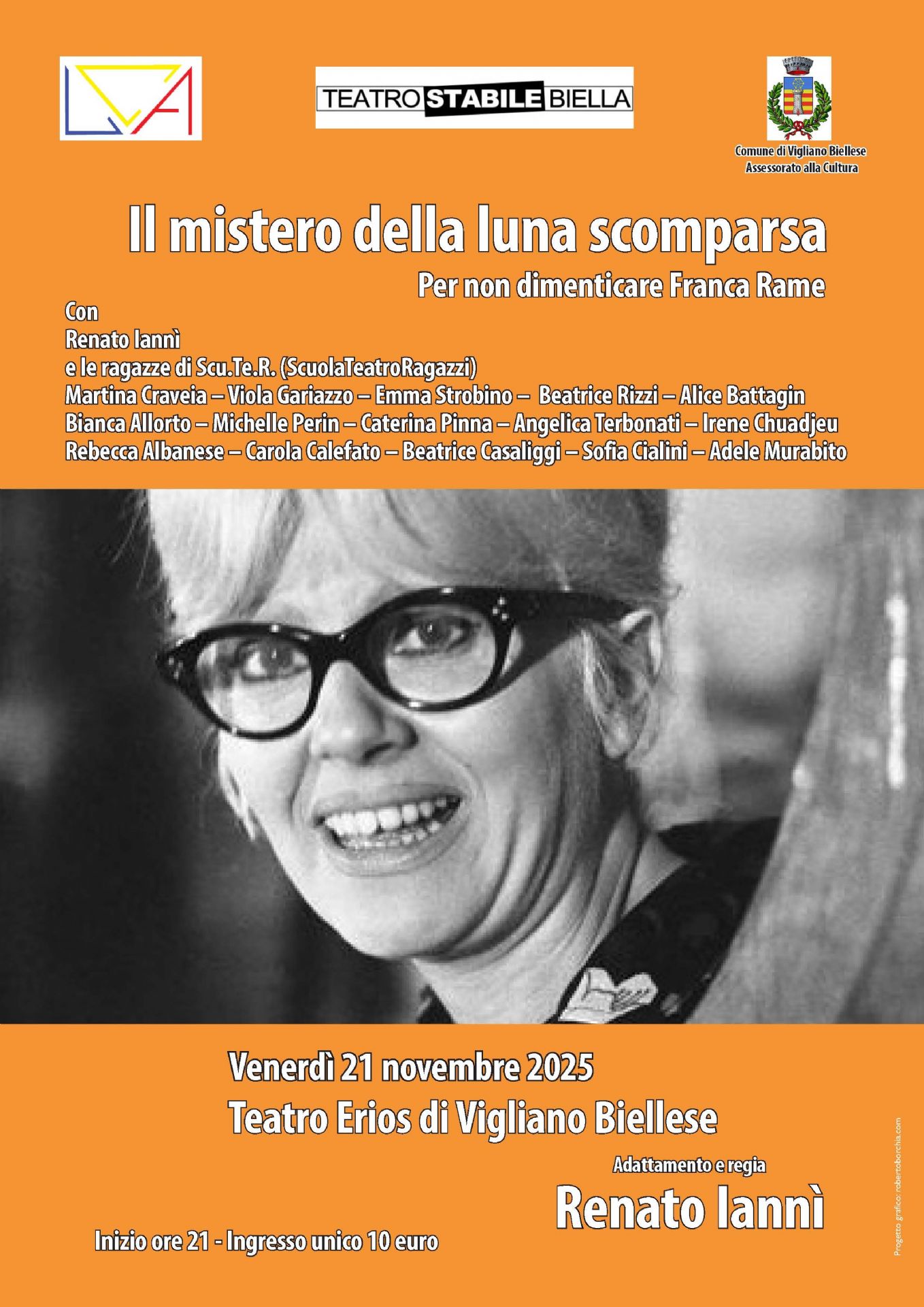 In occasione degli eventi dedicati alla giornata internazionale per l'eliminazione della violenza contro le donne, venerdì 21 novembre, alle ore 21. andrà in scena al teatro Erios “Il mistero della luna scomparsa. Per non dimenticare Franca Rame”, adattamento e regia di Renato Iannì. In scena, insieme al regista, un nutrito gruppo di giovani attrici del laboratorio Scu.ter - Scuola Teatro Ragazzi.