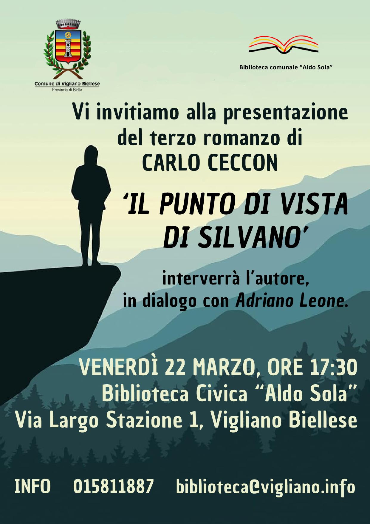 Venerdì 22 marzo, alle 17.30, la Biblioteca Civica “Aldo Sola” ospiterà lo scrittore Carlo Ceccon per la presentazione del suo terzo romanzo: “Il punto di vista di Silvano”, incentrato sull'animo umano e le relazioni familiari, in cui la montagna fa da sfondo ma anche diviene metafora dell'esistenza.
