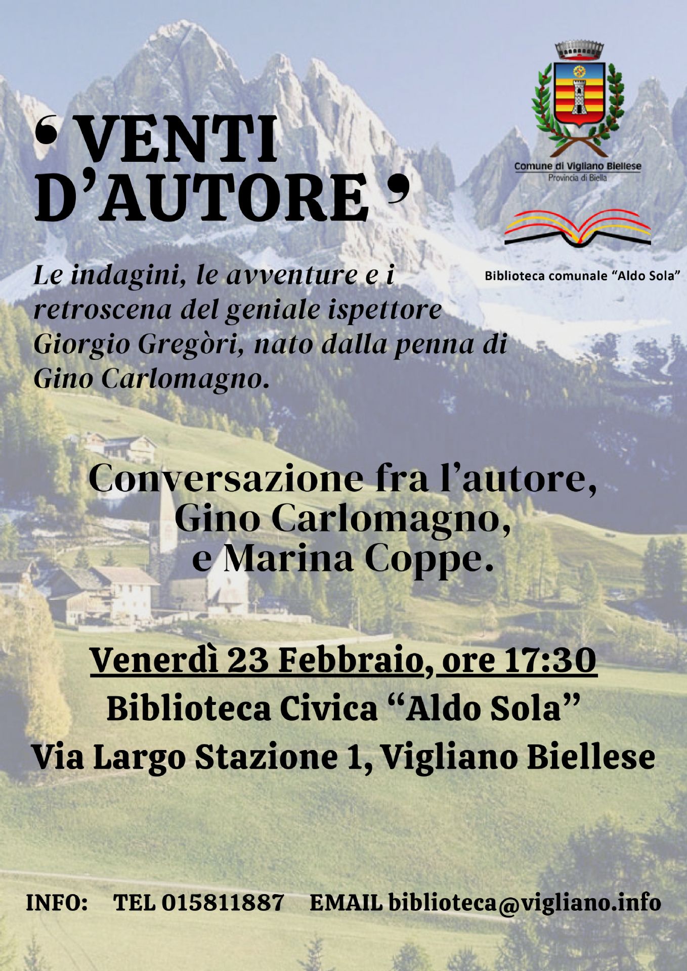 Venerdì 23 febbraio, alle 17,30 lo scrittore viglianese Gino Carlomagno sarà alla biblioteca civica Aldo Sola di Vigliano Biellese: un'occasione per festeggiare con il suo ultimo romanzo, “L’inganno dei numeri… uno,due, sette, nove. Casi risolti dall’ispettore Giorgio Gregori” la ventesima pubblicazione che vede protagonista l’ispettore di polizia Giorgio Gregori.