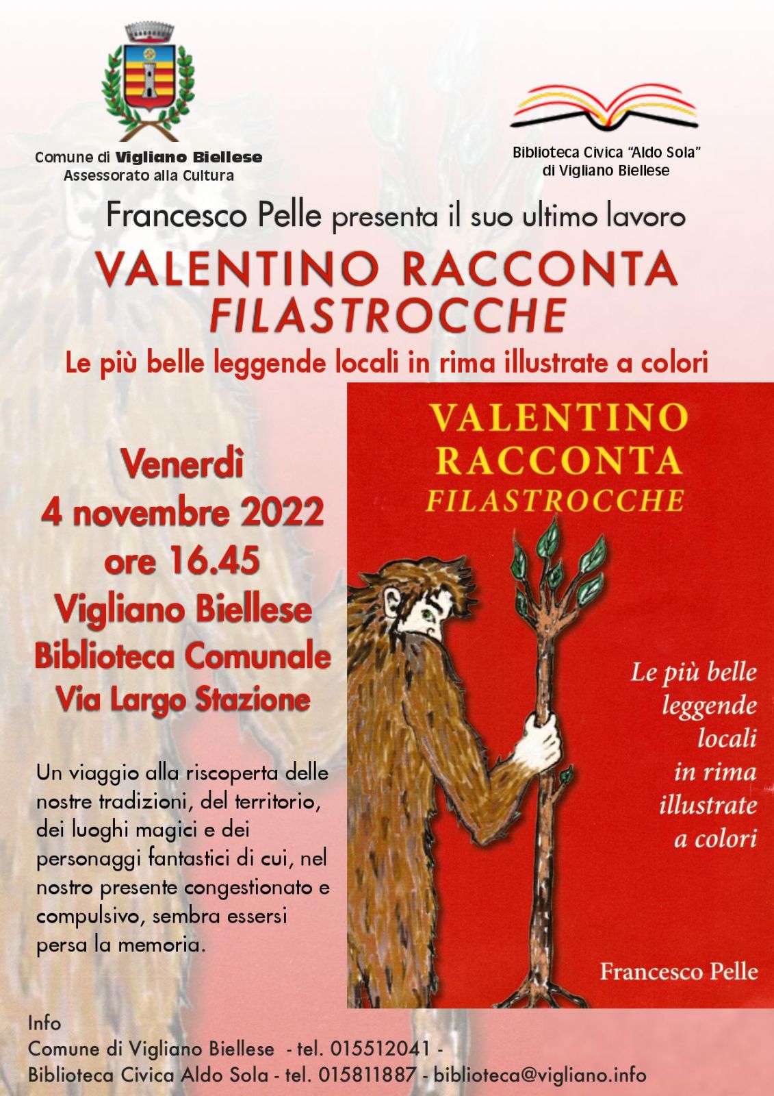 Venerdì 4 novembre, alle ore 16.45, la biblioteca civica ospiterà lo scrittore Francesco Pelle che presenterà il suo ultimo lavoro "Valentino racconta filastrocche - Le più belle leggende locali in rima illustrate a colori".