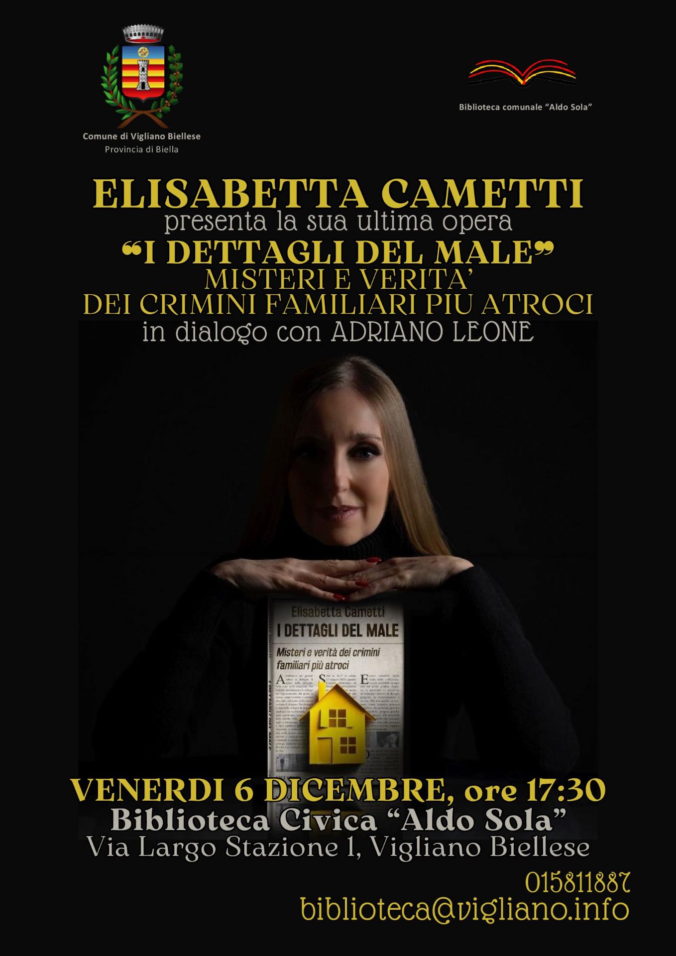 Venerdì 6 dicembre, alle ore 17.30, la Biblioteca civica "Aldo Sola" ospiterà la scrittrice Elisabetta Cametti che presenterà il suo ultimo libro, dal titolo "I dettagli del male - Misteri e verità dei crimini familiari più atroci". L'autrice dialogherà con Adriano Leone.